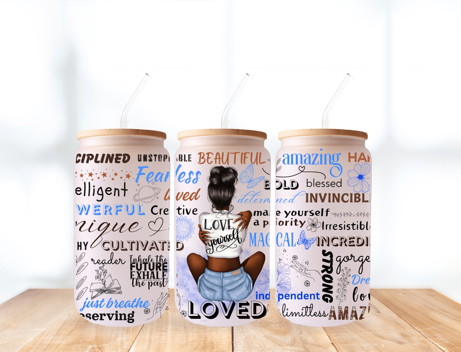 Stay refreshed and motivated with our 'Love Yourself ' 16-ounce glass tumbler. Made with high-quality, durable glass and capped with a natural bamboo lid with silicone ring, this tumbler is perfect for enjoying your favorite beverages, hot or cold. The reusable glass straw makes it an eco-friendly option for your daily hydration. It's not just a drinkware item—it's a statement piece, one sip at a time!"