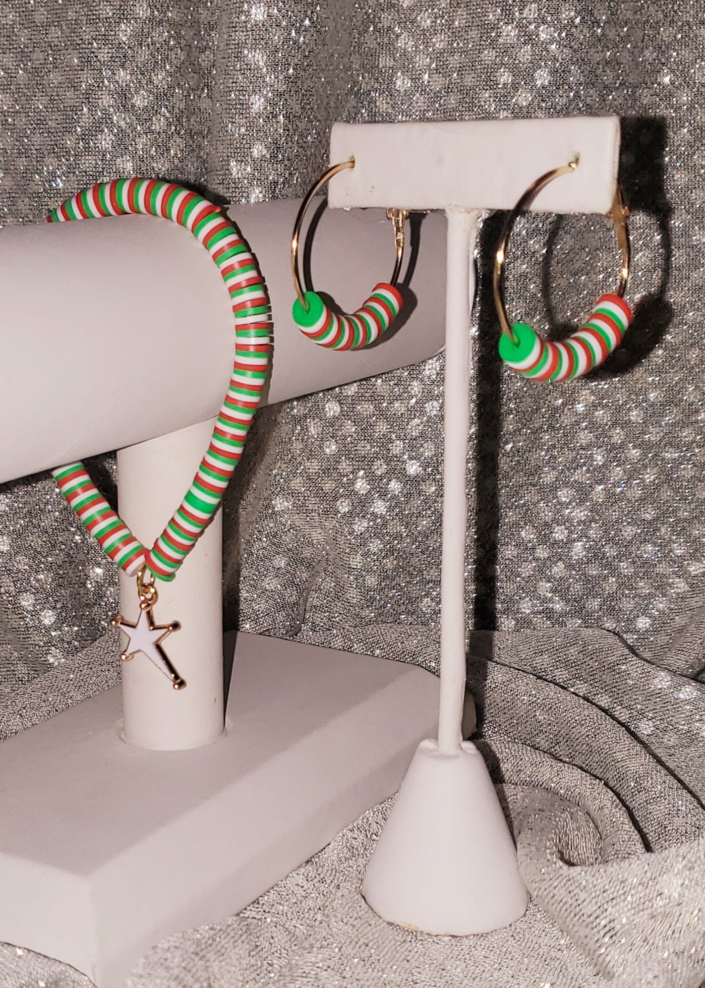 📦Red-White-Green Clay Bead Bracelet/Earrings Set #RMES4