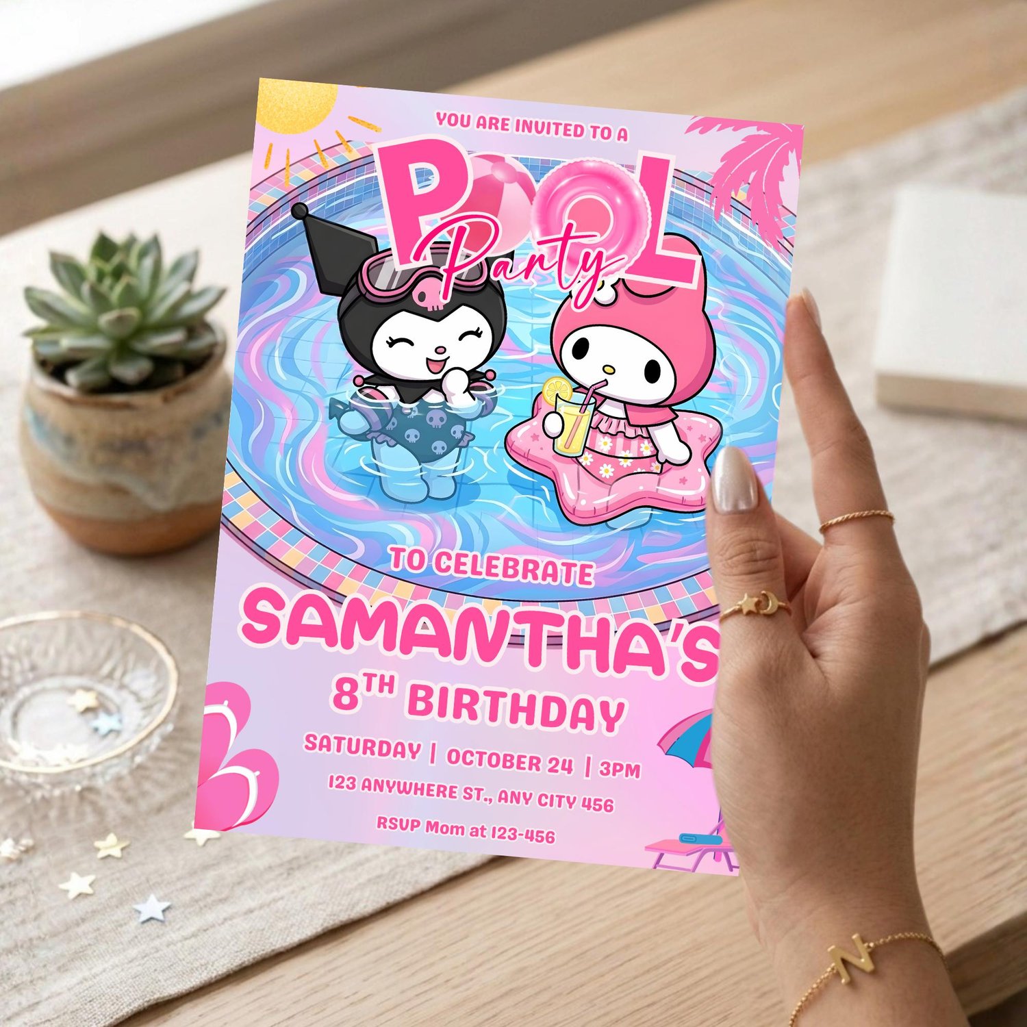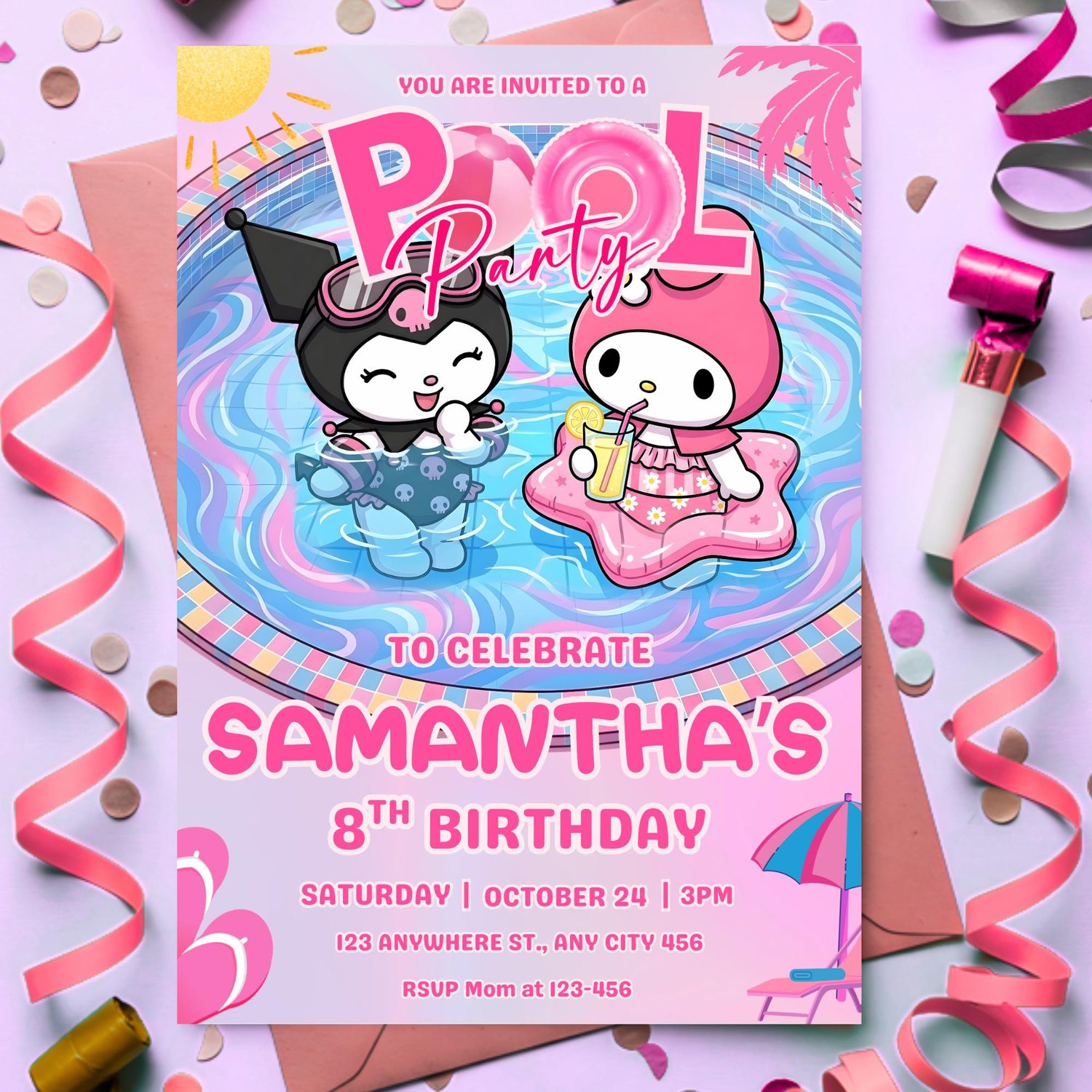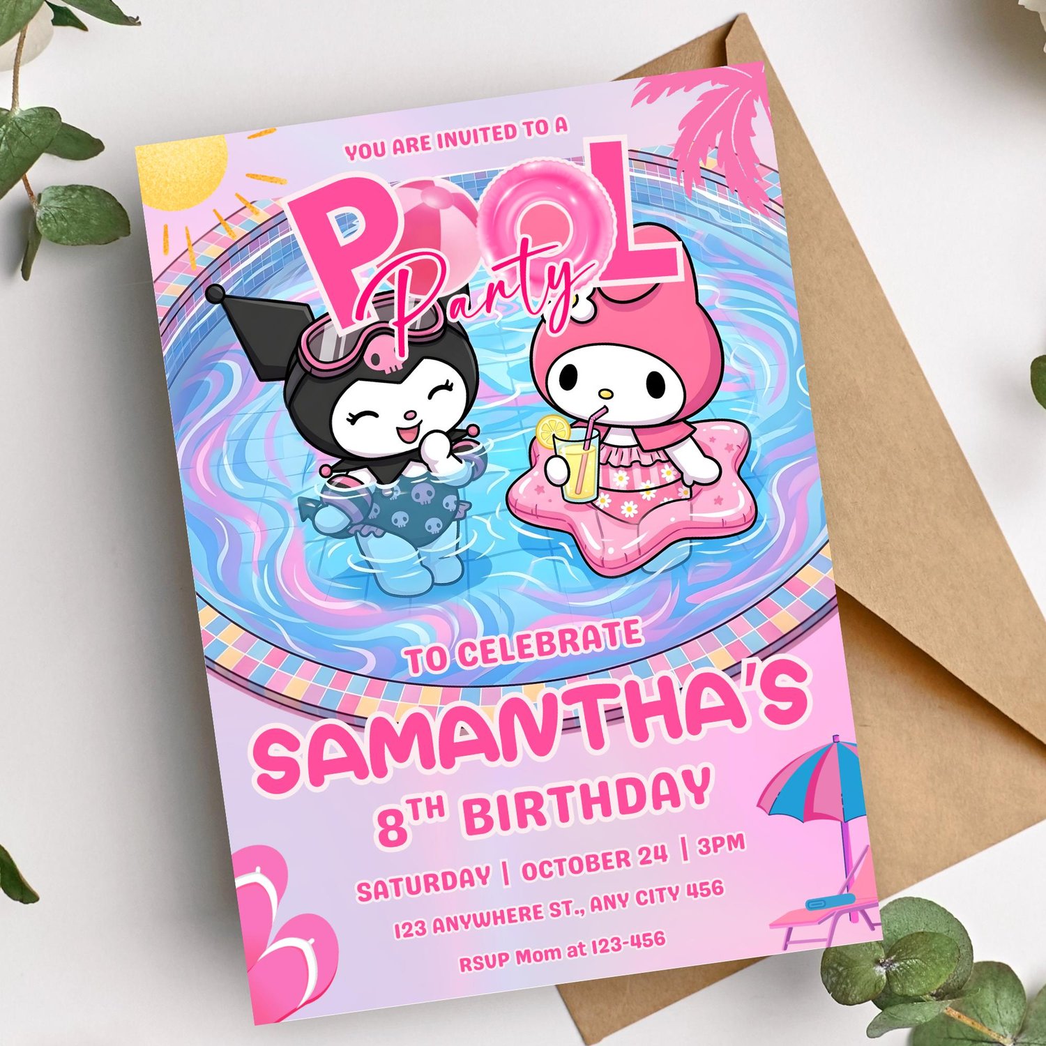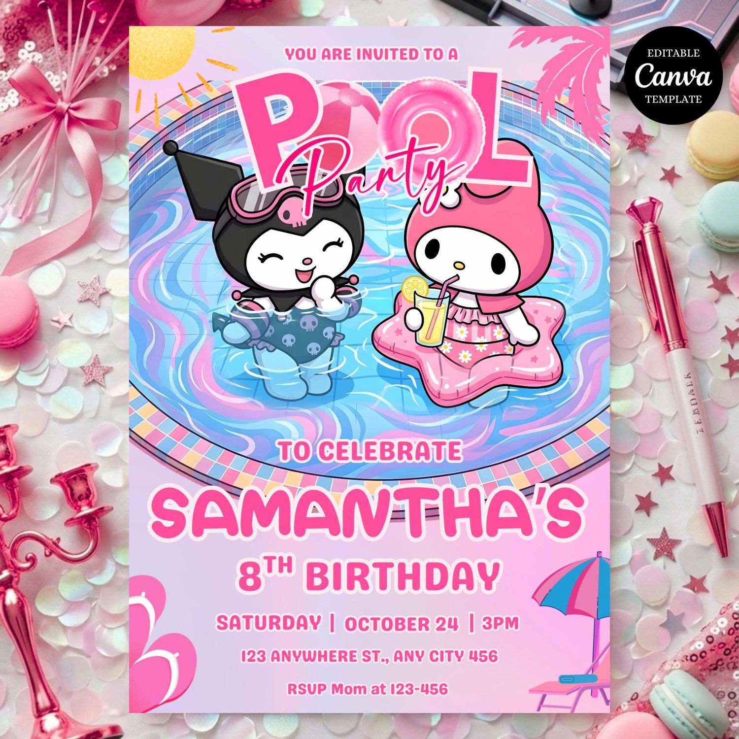 My Melody and Kuromi Pool Party Invitation | Editable Canva Template