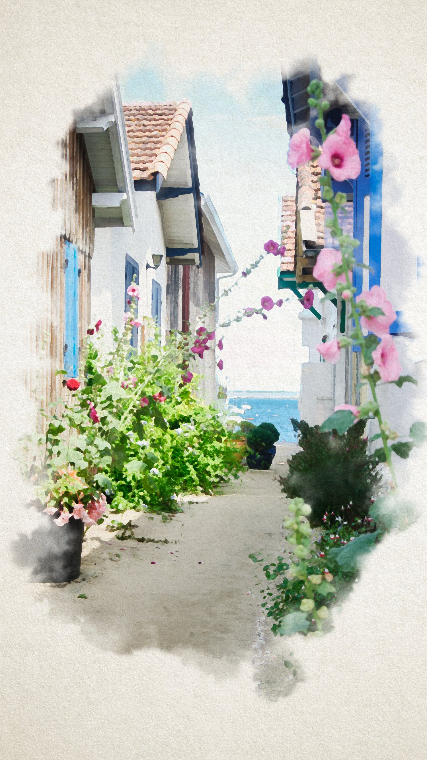 Step into the dreamy atmosphere of the Bassin d'Arcachon, where narrow alleys wind past weathered wooden houses draped in blooming hollyhocks. This original watercolour captures the gentle poetry of the French Atlantic coast — soft washes of blush pink and sage green, the shimmer of sea light filtering through flowers, and the quiet charm of a village that feels like a painting in itself.