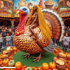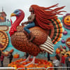 A striking woman with flowing, floor-length dreadlocks rides a gigantic turkey adorned with vibrant carnival decorations. With her radiant smile and bold spirit, she embodies joy and adventure, turning the bustling carnival into her whimsical kingdom.