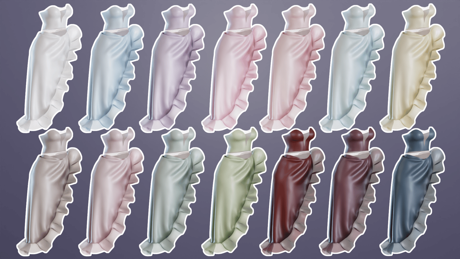 Base textures has build in opacity (no need for opacity map), but also comes with an option that uses alpha. Also has PSD files for each version to easily change color for the nude toned mesh parts or the dress itself. I recommend playing around w the different layer settings after how dark/light/vibrant etc u want the colors (multiply, color, soft light, overlay often works best)