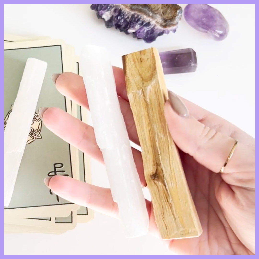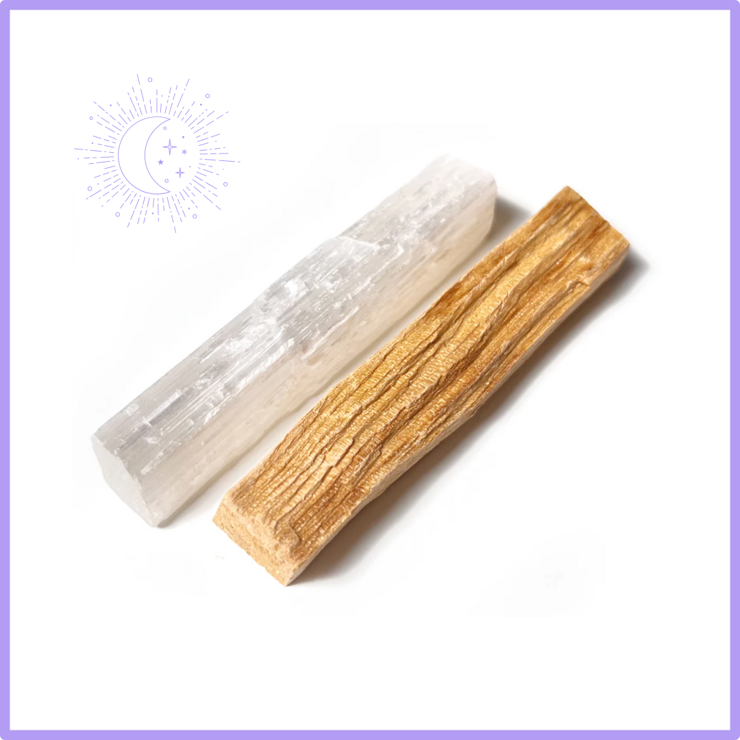 Palo Santo viðarkubbur og Selenite kristall saman í setti.