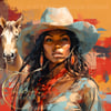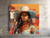 Watercolor Orange & Beige Black Cowgirl & Horse, PNG Illustration, African American Wall Art, Cover Design, Art Prints