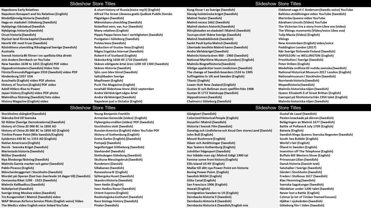 Denna samling med 1 081 Bildspel kan i sin helhet laddas hem under gruppen ABC Varje bild har ett antal bildspel som är bildspel i samlingen och vars titel innehåller utmärkta bokstäver som utgör titlarnas första bokstäver. Praktiskt för att ladda hem 1 082 bildspel krävs 28 inköp via Slideshow Store. Pris är 5 USD + Moms 25 % och filformat är PPT. (Power Point) vilket kan ändras och nya bilder eller ändringar kan införas. Praktiskt för utbildning som kan anpassas för nya behov eller strategier. Klicka på länken för att ladda hem bildspel med olika bokstäver A till Ö som första bokstav i en given titel. Vill man bara ladda hem titlar som börjar med A går det bra. Vill man bara ladda hem ett bildspel och har titeln, skriv in i butikens sökruta och ladda hem från butiken. Samma pris 5 USD + Moms 25 %. Den totala samlingen har utökats med flera tusen nya bildspel under åren 2022 till 2026.