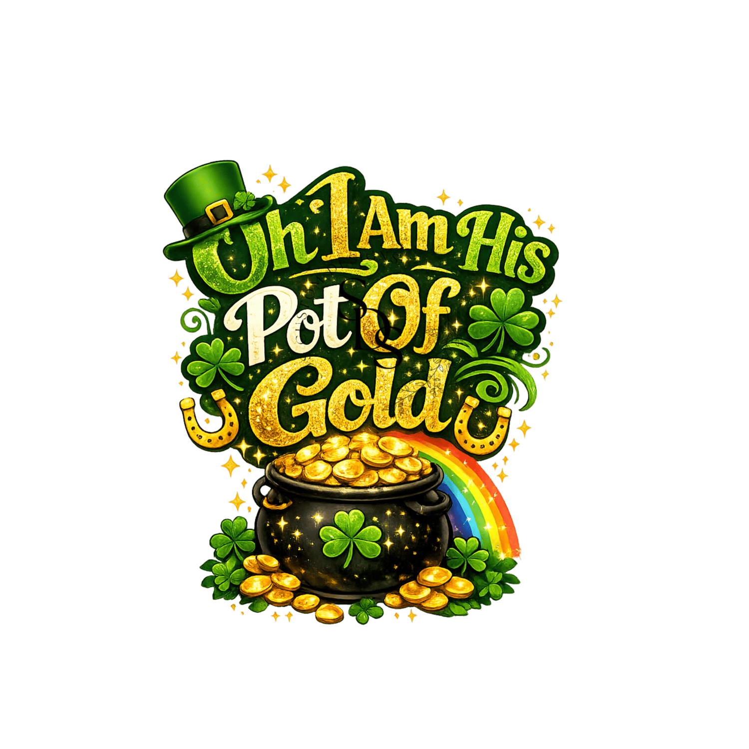 Celebrate St. Patrick’s Day in style with this vibrant and festive “Oh, He Found His Pot of Gold Right Here” digital design! Featuring a glittering pot of gold, shamrocks, horseshoes, sparkles, and a bold green and gold theme, this high-quality PNG is perfect for creating eye-catching apparel and accessories.