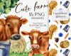 Milk farm clipart: cow, calf, iron bucket, clay pitcher, cornflower, wooden fence, wooden board, grass, sheaf, straw roll.