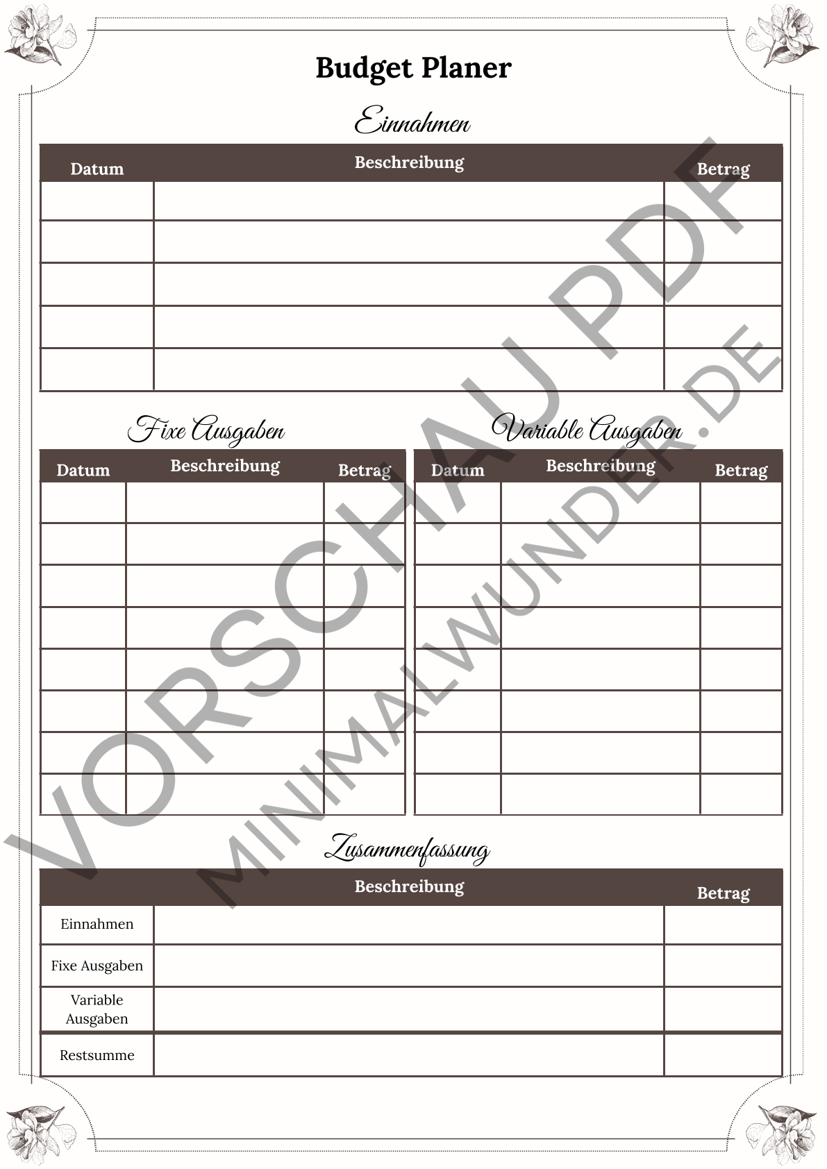 Mit diesem praktischen Budget Planer behältst du deine Einnahmen und Ausgaben jederzeit im Griff. Ob private Haushaltsplanung oder geschäftliche Finanzen, die übersichtlichen Tabellen helfen dir, alle Fixkosten, variablen Ausgaben und Einnahmen klar zu strukturieren.