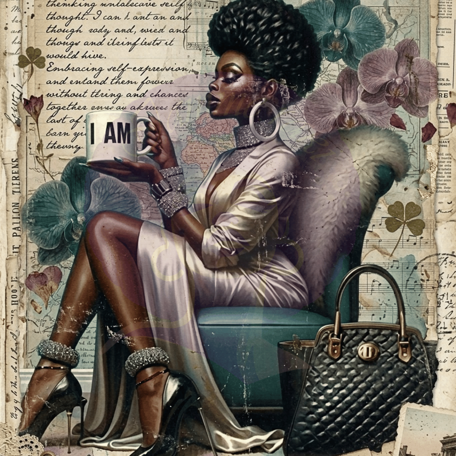 This piece blends Afrocentric beauty with dark romanticism, layered in vintage textures and soft gothic detail.