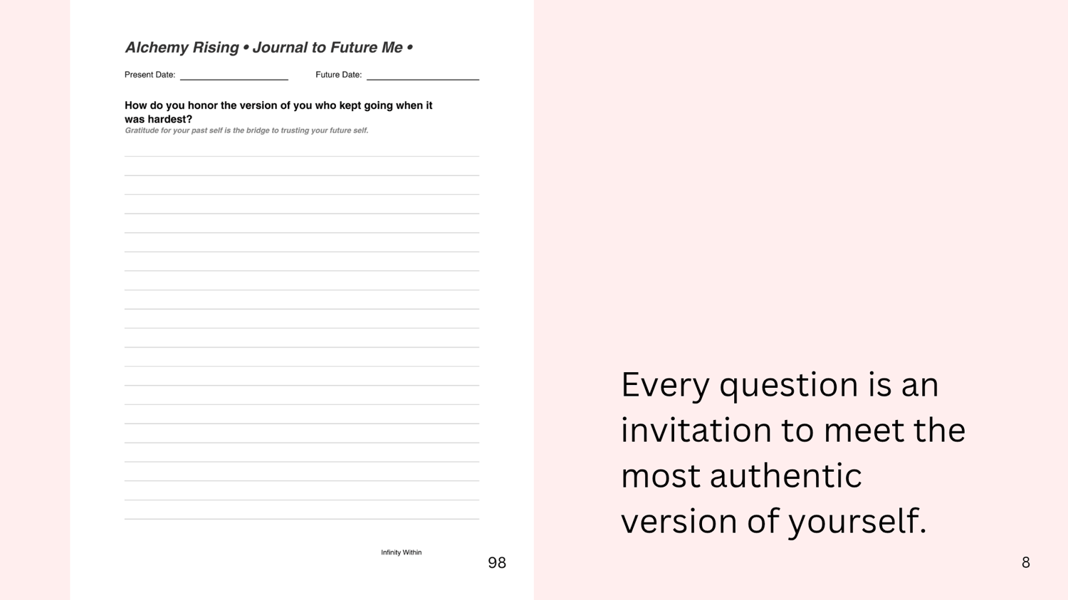 Are you ready to rebuild trust in yourself, break free from old patterns, and step fully into alignment with your future? Future you has a message for you right now and that message is that you win! You make it! This Journal practices aligning your subconscious to your successful practices by writing from an embodiment of future you who has already solved the problems, had the hard conversations, done the things you're hiding from and congratulating you on all the successes. These journal entries from future you to current you is like getting a giant Soul hug from yourself saying that you can do everything that you're meant to do.