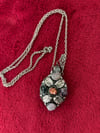 19th century antique Ottoman Empire silver perfume scent bottle necklace. Charming decoration with semi-precious stones on both sides and relief flowers between them!