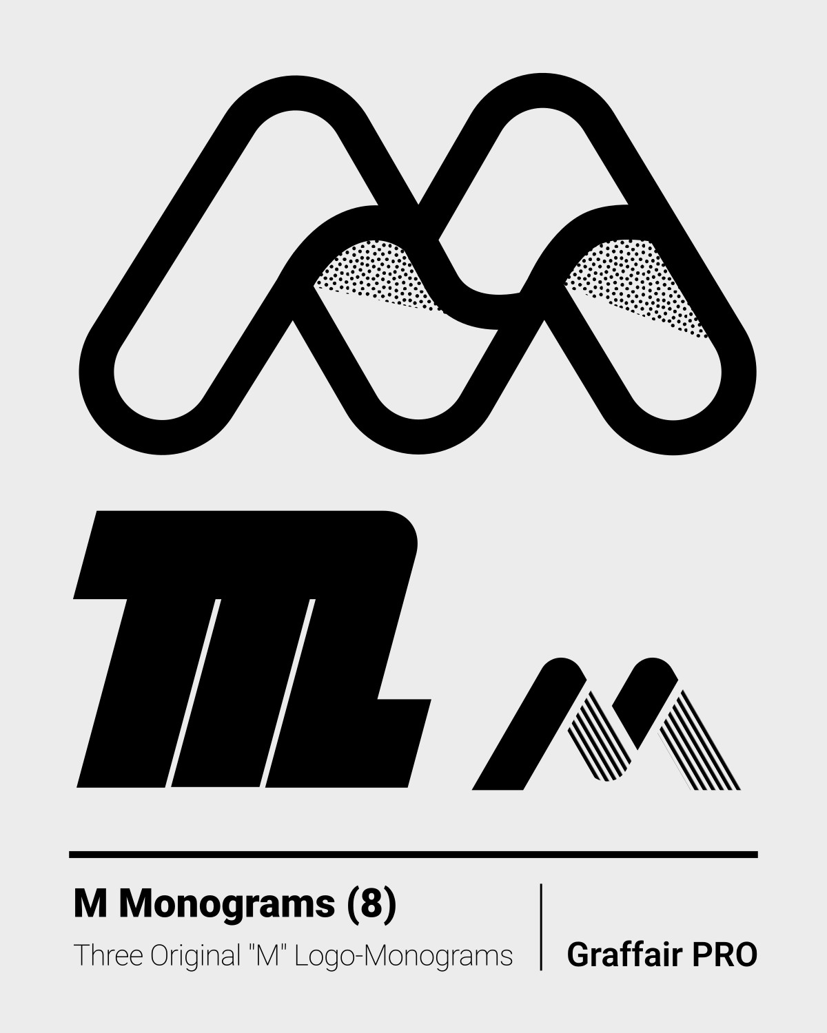 M Monograms (8): The 8th set of three original "M" logo monograms, included in the "1050 SVG Monograms" super bundle, which also features an Index catalog.