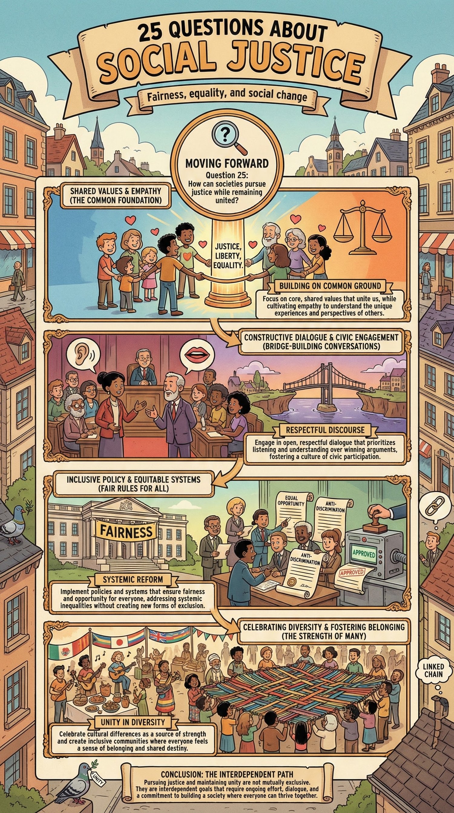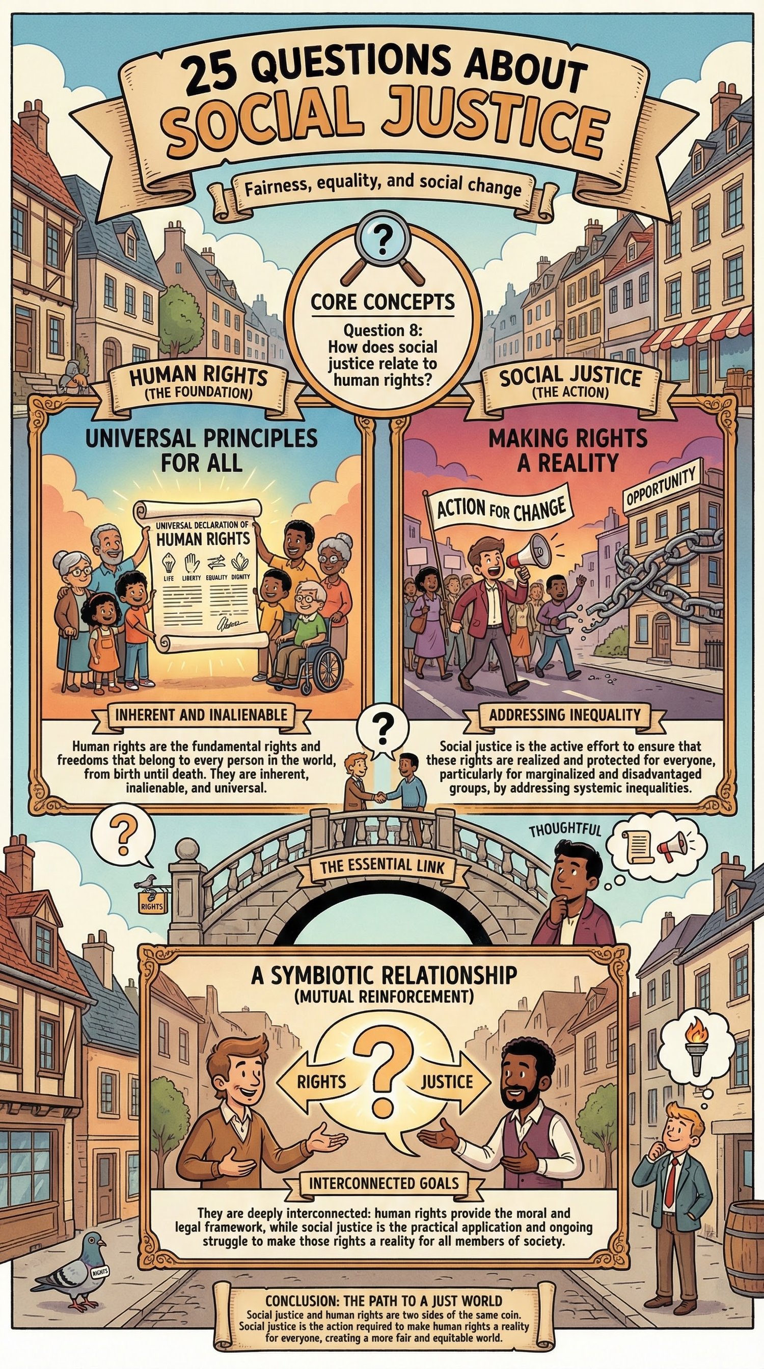 25 Questions About Social Justice is a beautifully illustrated educational book that explores how societies define fairness, equality, and rights, and how these ideas shape social movements, institutions, and everyday life.