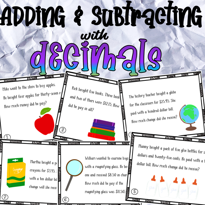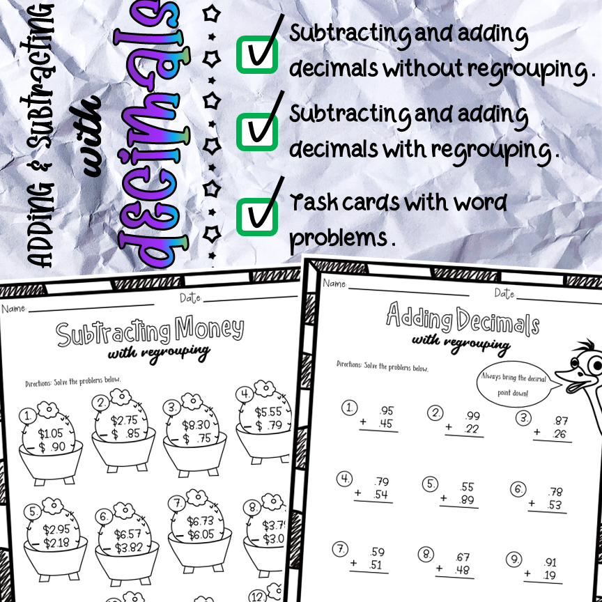 This set of sheets includes a poster for math journals/folders, plenty of practice worksheets for the kiddos with subtracting and adding decimals with and without regrouping. Contains 20 task cards with word problems in which the student will practice writing out numbers with decimals. This zip files contains FILLABLE forms for distance learning, printable worksheet set, and answer key.
