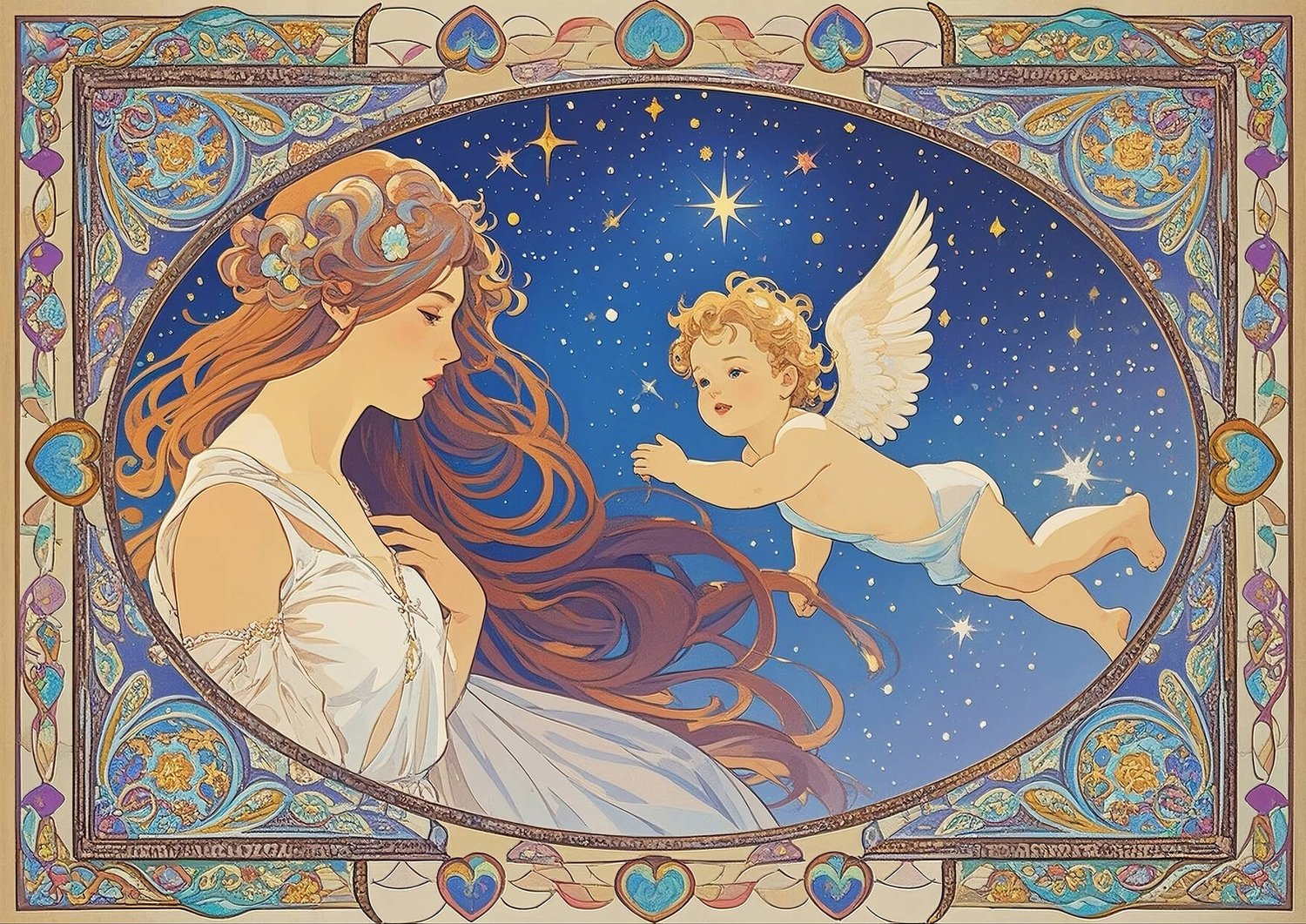 A beautiful goddess with flowing hair tenderly embraces a heart of love, surrounded by swirling stars, cosmic waves, spirals, and luxurious celestial patterns.