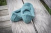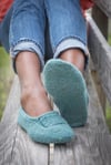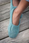 Harrisville Highland is a fairly springy, durable, woolen-spun, 2-ply worsted weight yarn. I chose this yarn for the sample because it’s hard wearing, has good memory, is fairly inexpensive, and comes in a wide range of beautiful colours. The woolen-spun structure gives a light, cushy, cohesive fabric for a comfortable surface under your feet. Though the yarn starts out a bit crunchy, it softens with washing and wear. If you’re substituting another yarn for this project, look for a wool or wool blend with good memory that feels comfortable on your feet and gives a solid fabric at the pattern’s gauge. Merino and superwash merino will work, just be aware that the finer fibres won’t stand up to wear as well as stronger wools.
