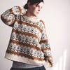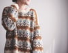 Due to the wide motif the pattern comes in only 6 sizes, each with an approx. 16.5 cm/6.5” difference in circumference to the next size, to fit a range from 60 cm/26” to 155 cm/62” chest circumference.