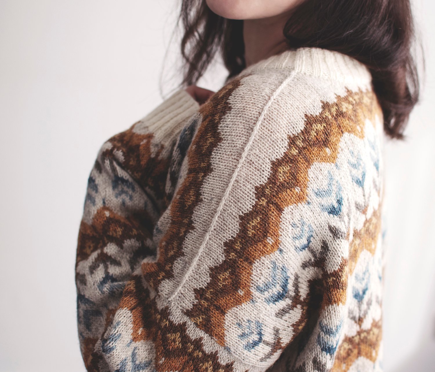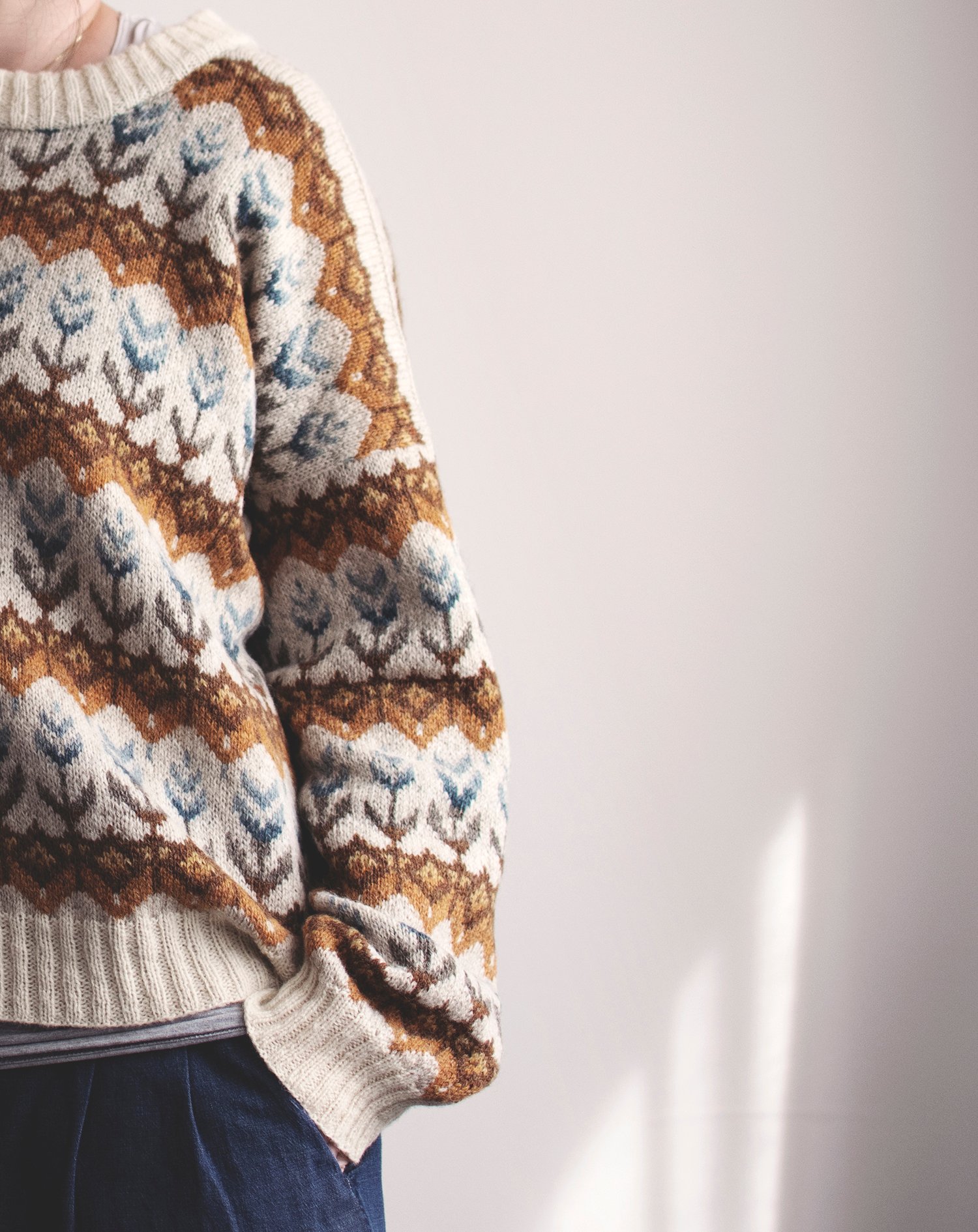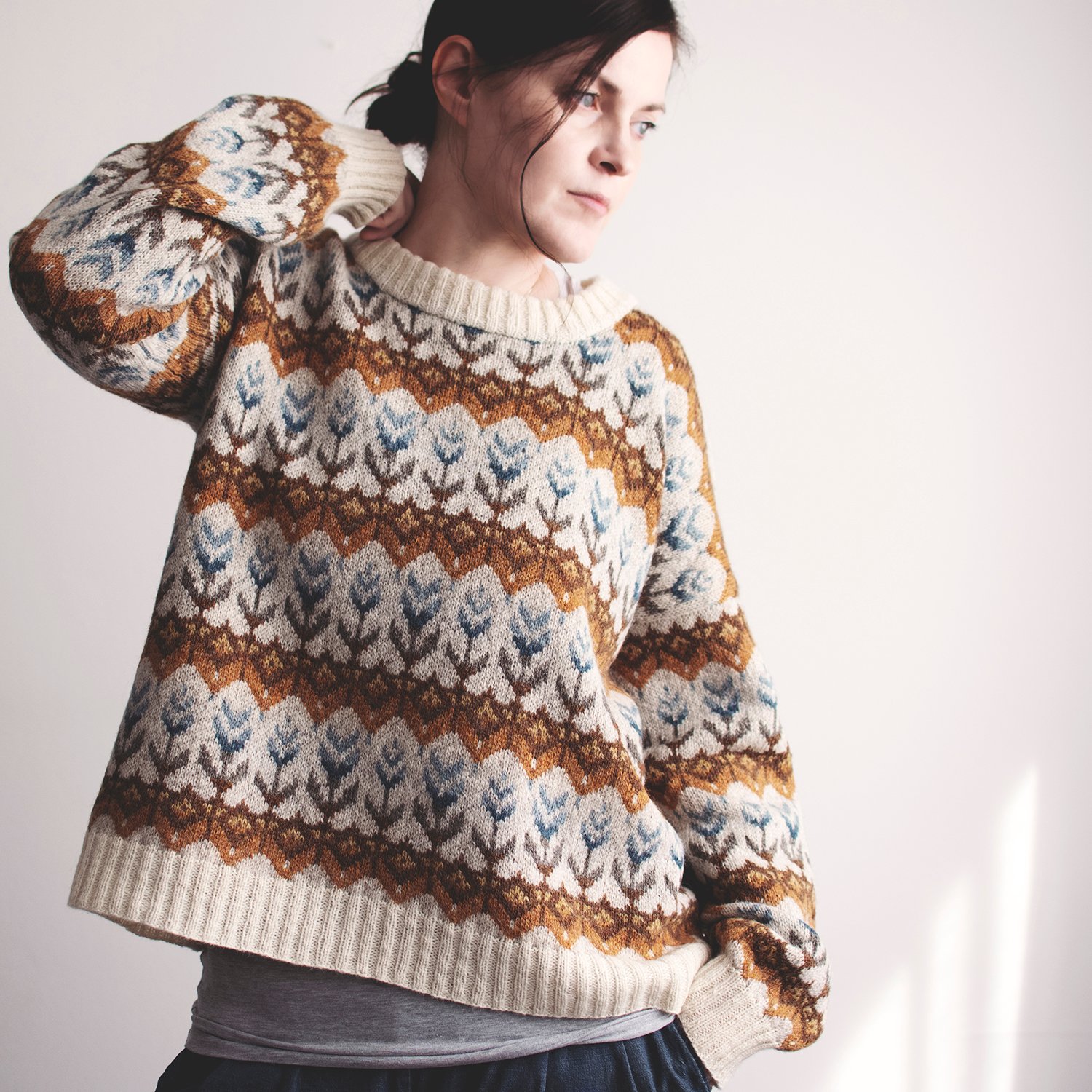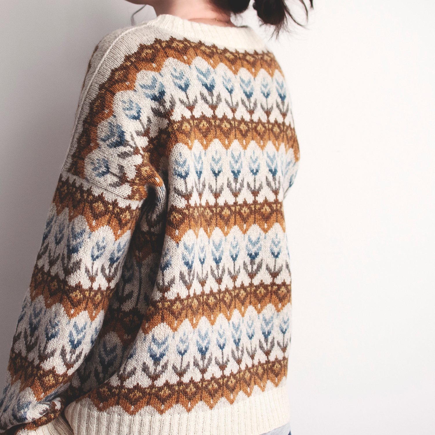 The shoulder and the initial neckline shaping for back and front are worked flat in MC using short rows, before it is all joined in the round for the color work, with steek stitches for the armhole and neckline openings. Yoke and body are then finished top-down in the round, with a faux seam at the sides as a special feature.