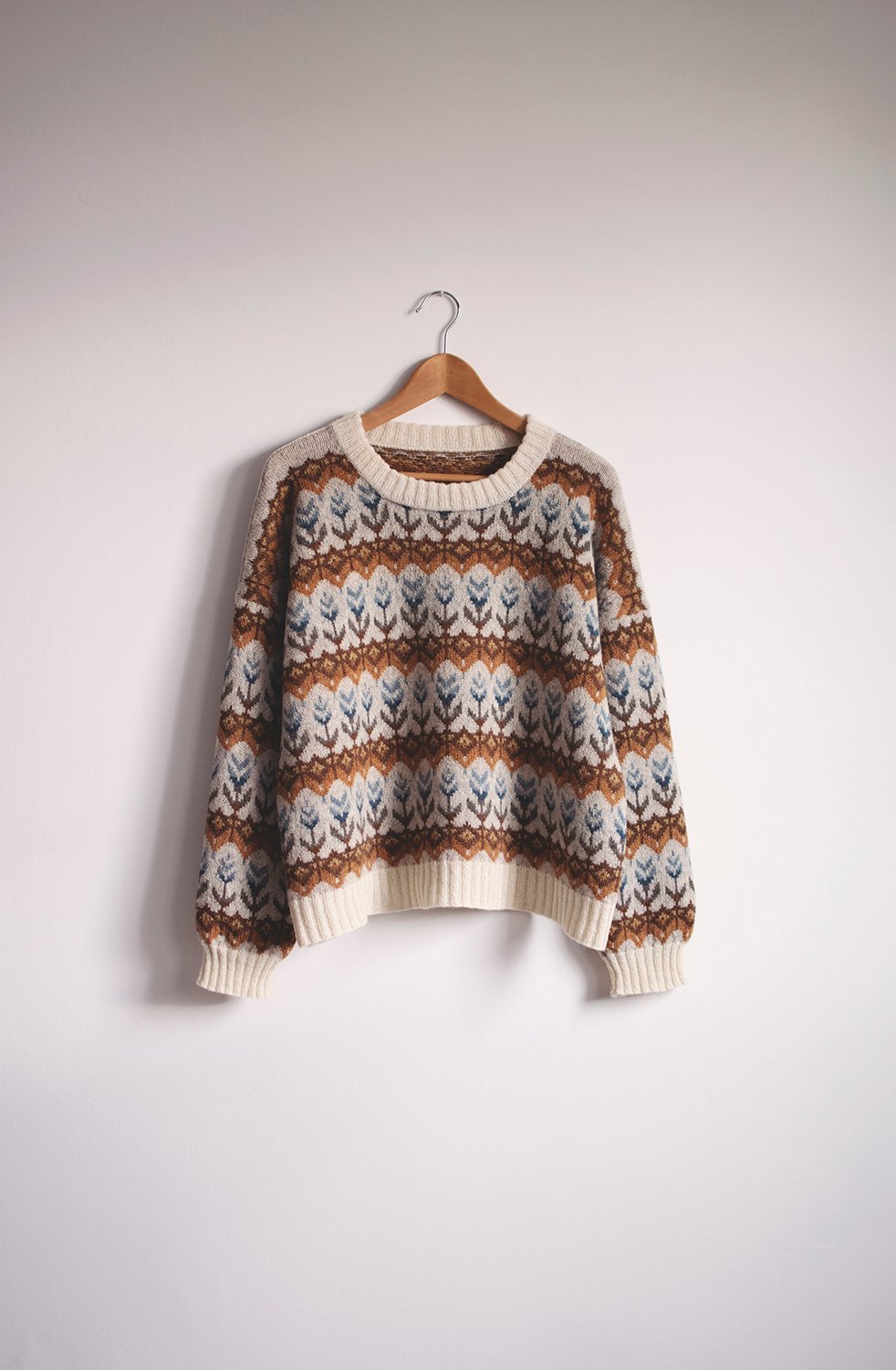The pullover is worked top-down as a dropped shoulder construction. It starts at the shoulder with two sets of double-knitting cast-on, which will give the impression of a tight line of stitches running down the shoulders.