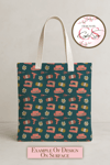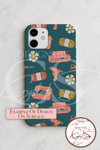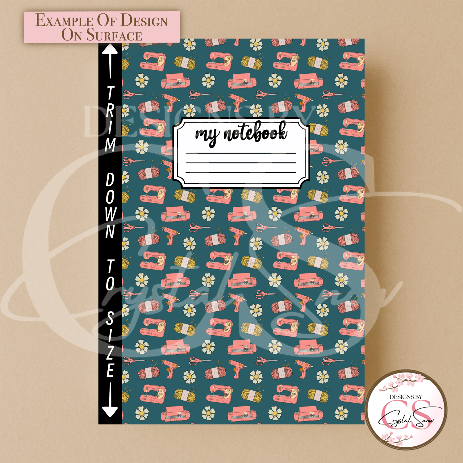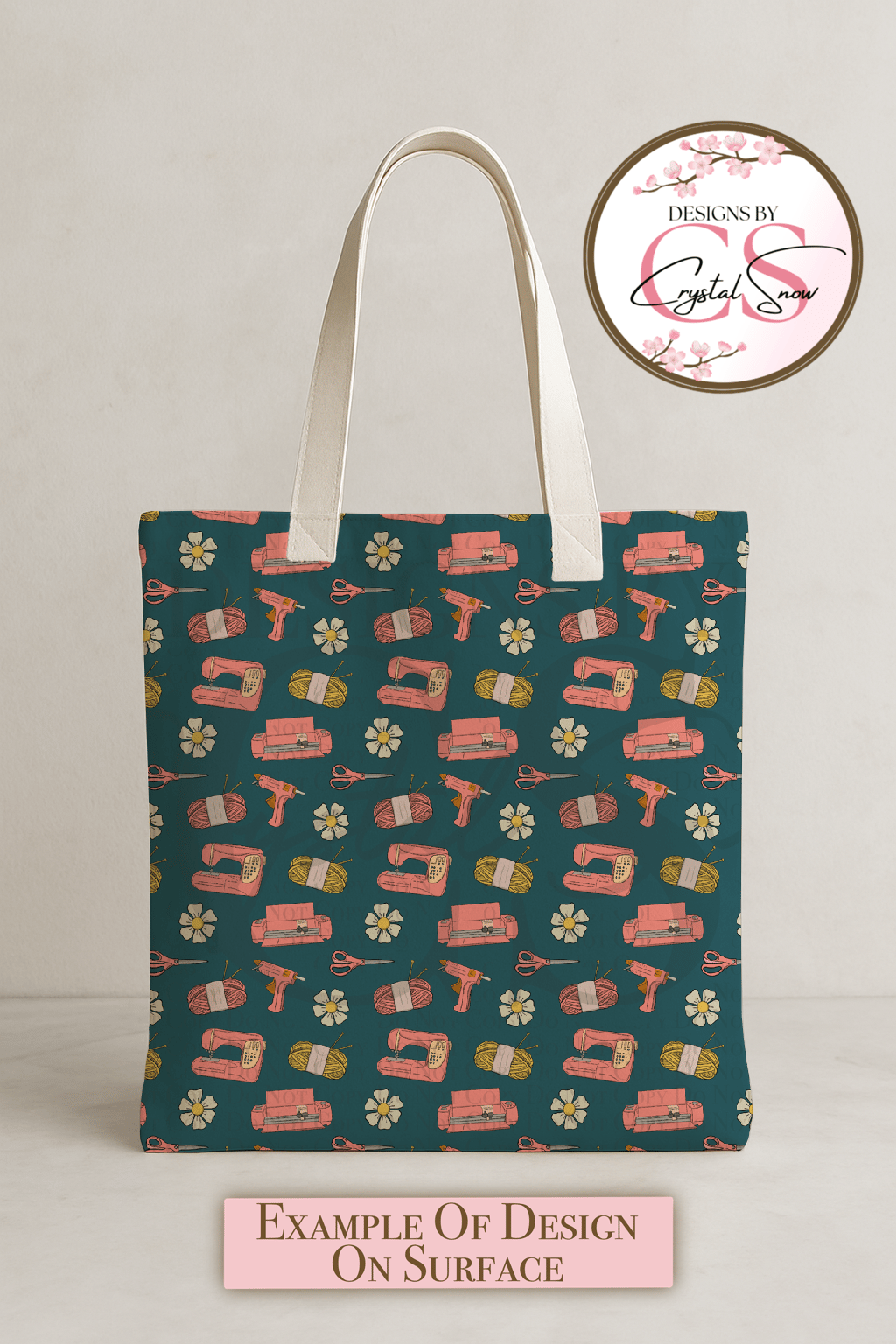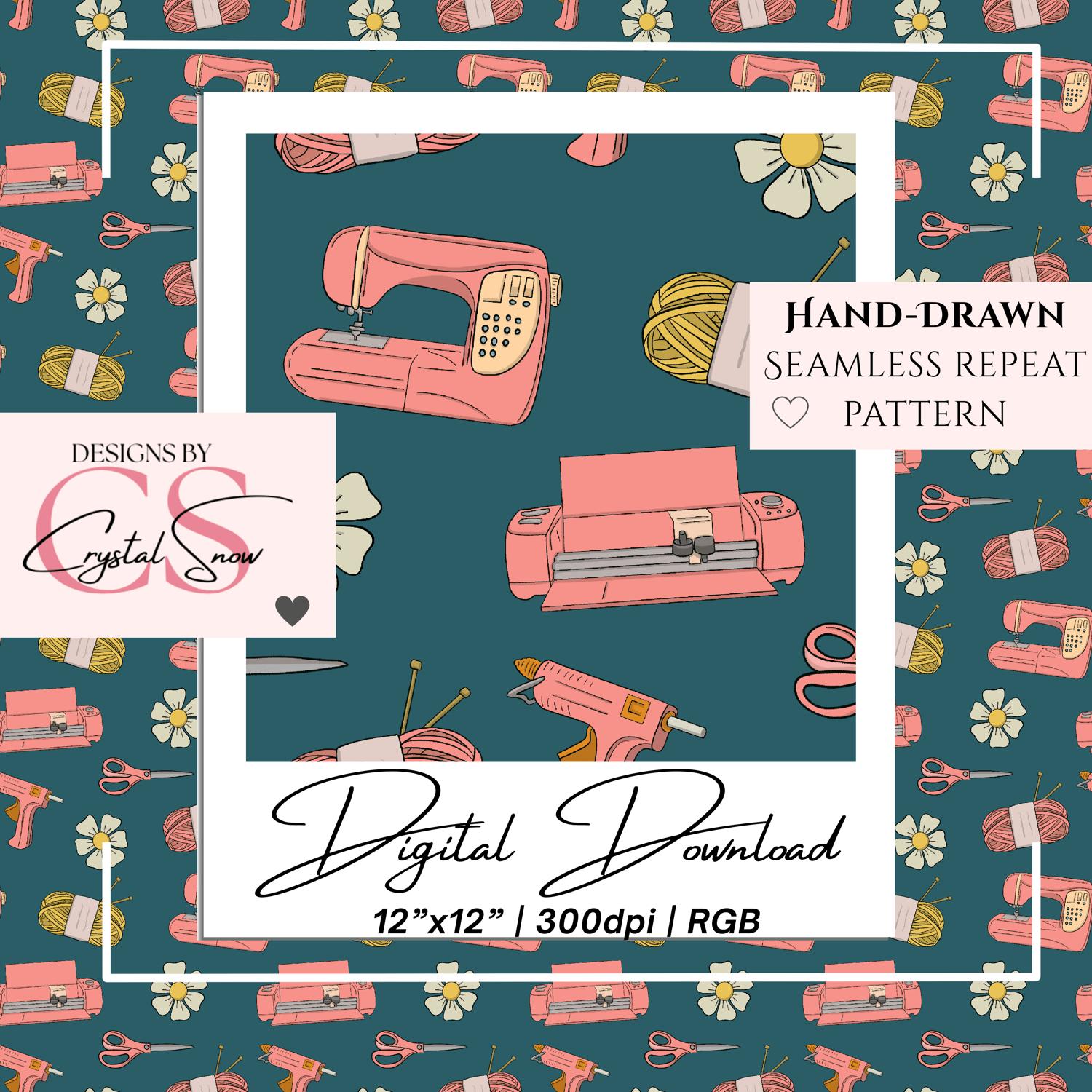 This hand-drawn seamless pattern features all the crafting essentials: Cricut machines, yarn spools, sewing machines, scissors, flowers, and glue guns — all arranged on a rich teal background with cozy pink tones. Perfect for crafting-themed projects, small business branding, or digital paper collections that speak directly to the DIY heart.