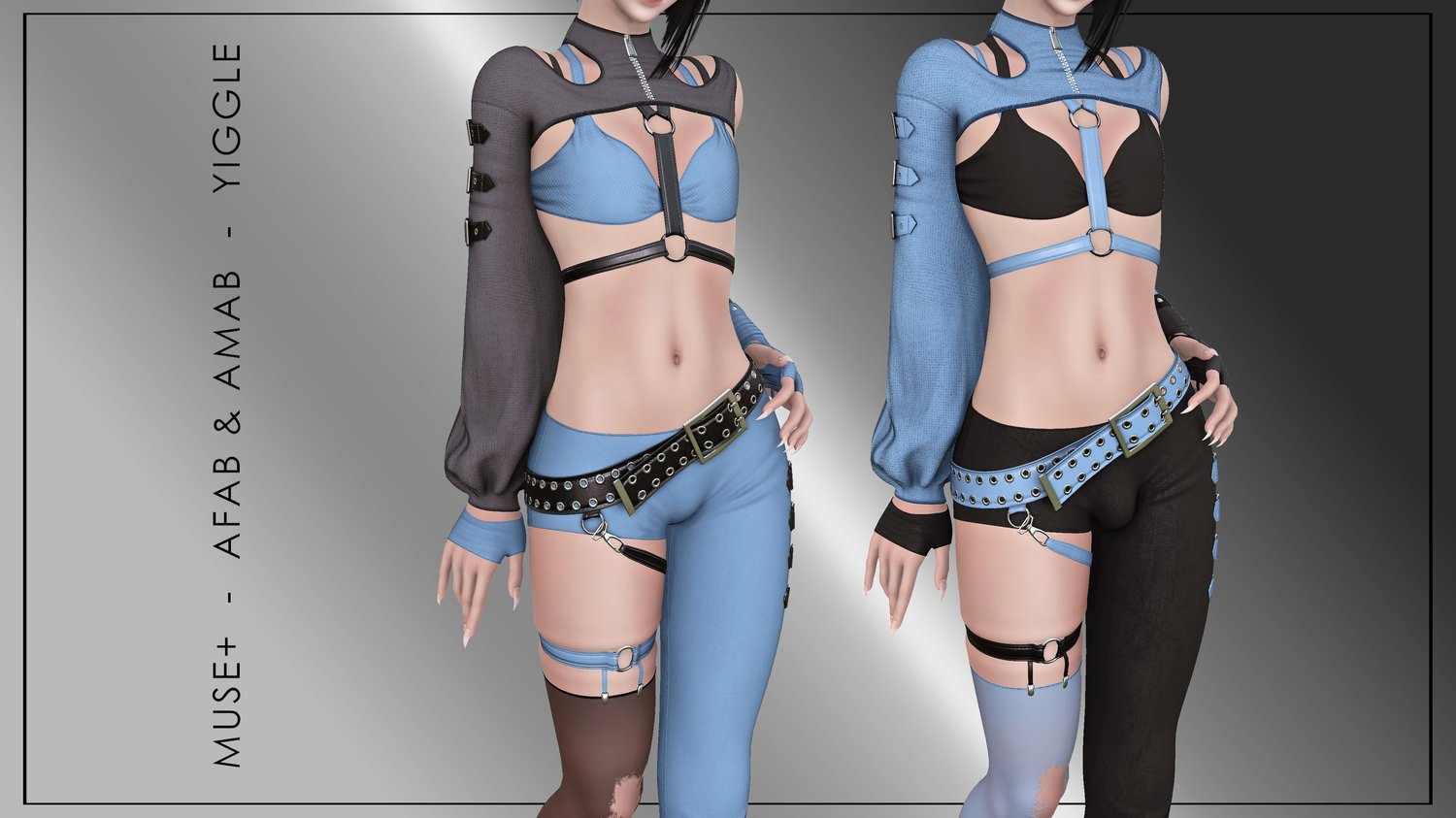 An edgy three piece outfit consisting of a bra paired with a harness and a cropped asymmetrical jacket, asymmetrical belted leggings paired with a ripped stocking, and a pair of gloves.