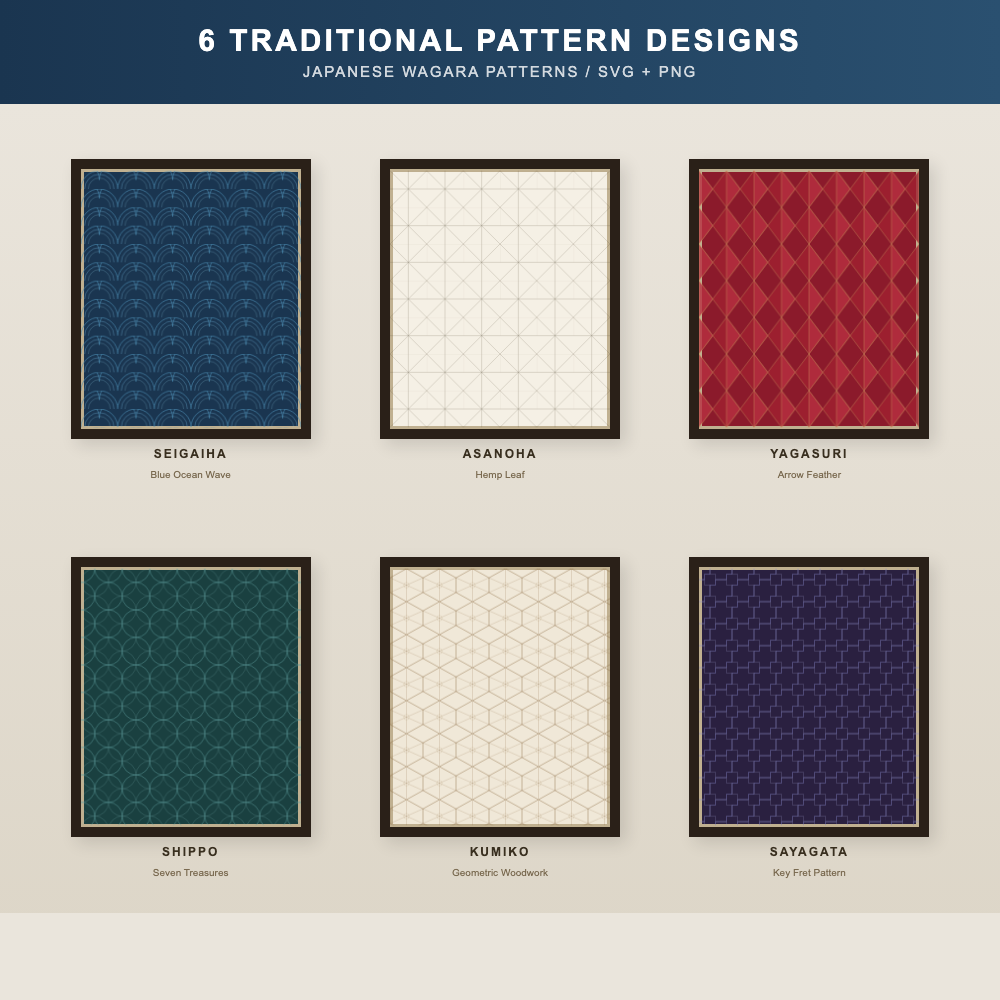 Japanese Pattern Wall Art 6-Pack | Traditional SVG Designs | Seigaiha Wave Asanoha | Digital Download