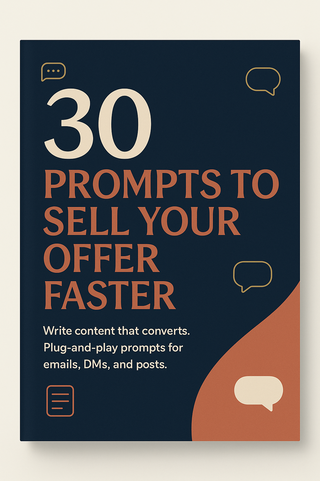 - 30 tested prompts (sales emails, DMs, CTA captions, objection-busters, urgency boosters, and more)