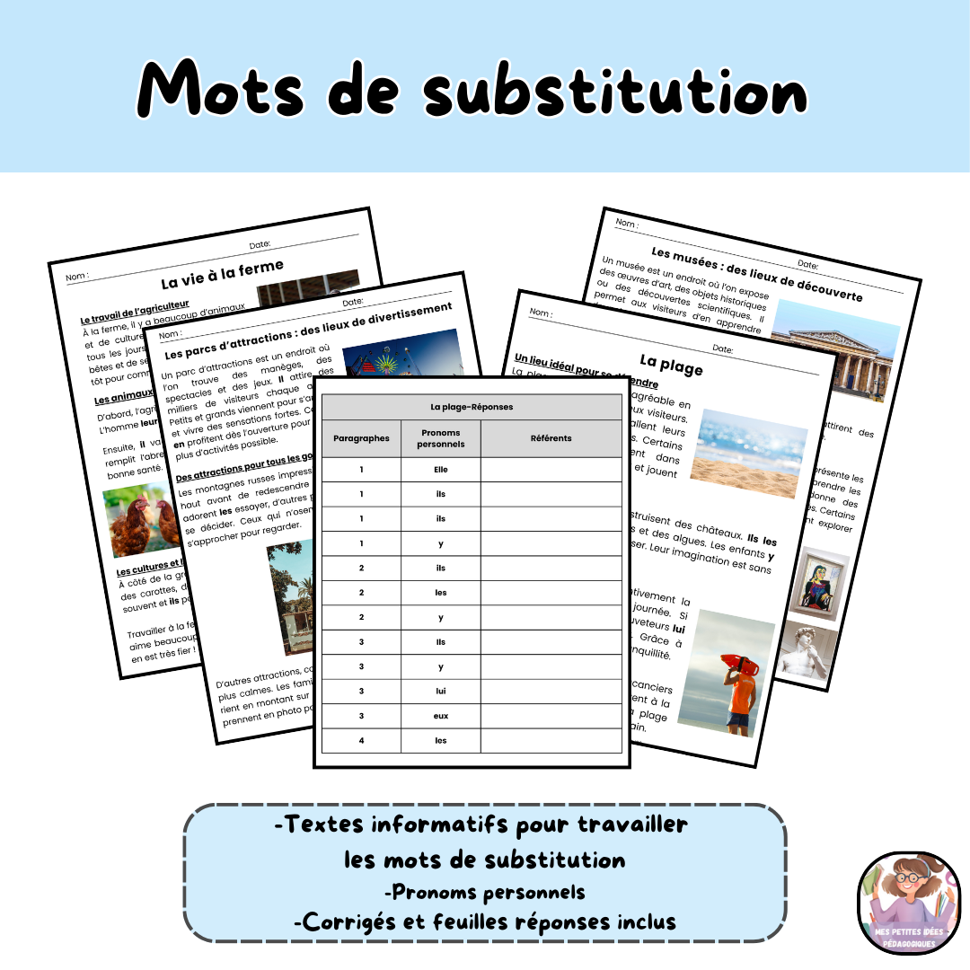 Travaillez la compréhension des mots de substitution (pronoms personnels) grâce à ces 4 textes informatifs.