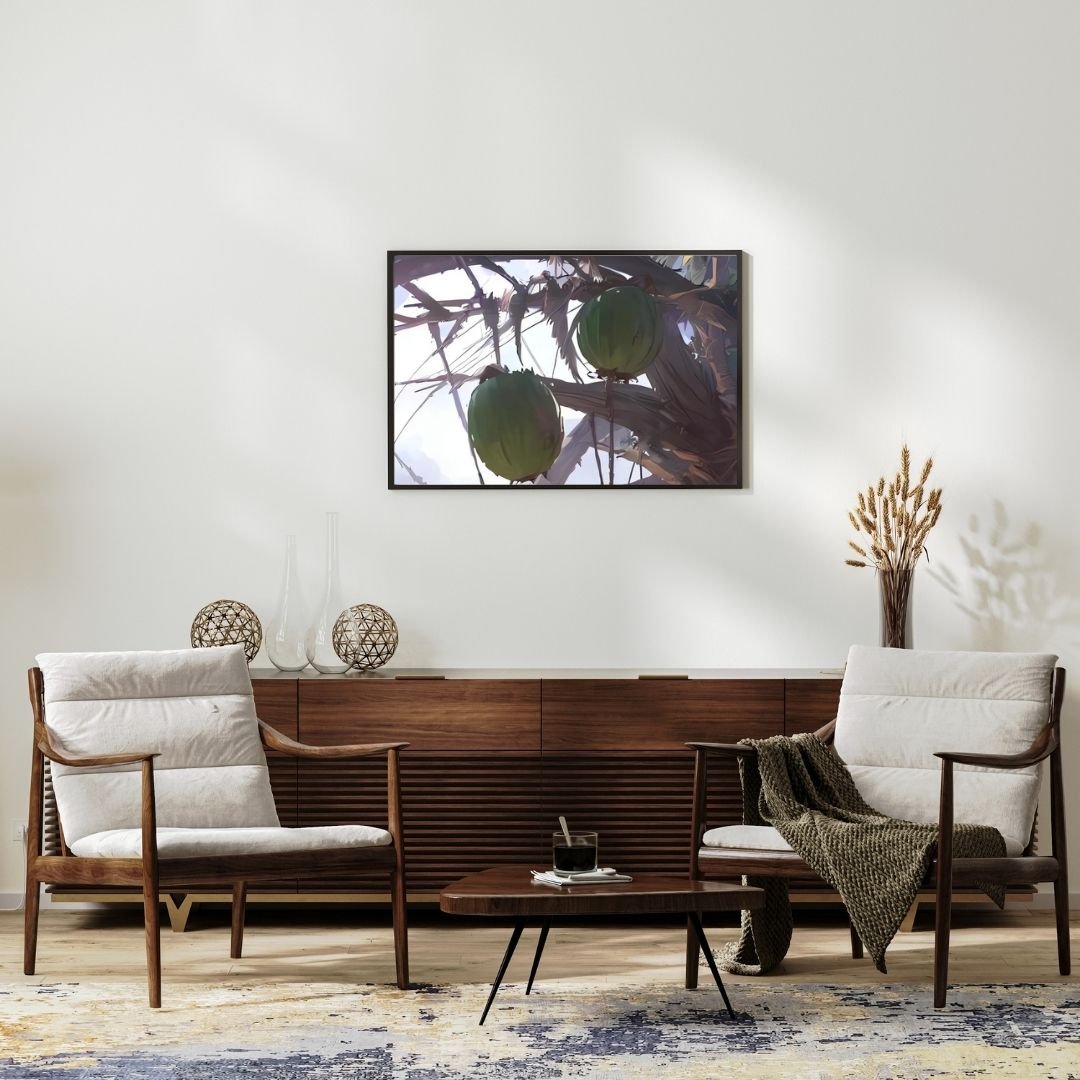 Invite the calm of the tropics into your home with this Coconut Wall Art, inspired by a real Venezuelan palm tree photographed in 2008. The design celebrates the gentle beauty of coconuts and palm leaves, lovingly transformed into a digital artwork that you can enjoy in any size and style.