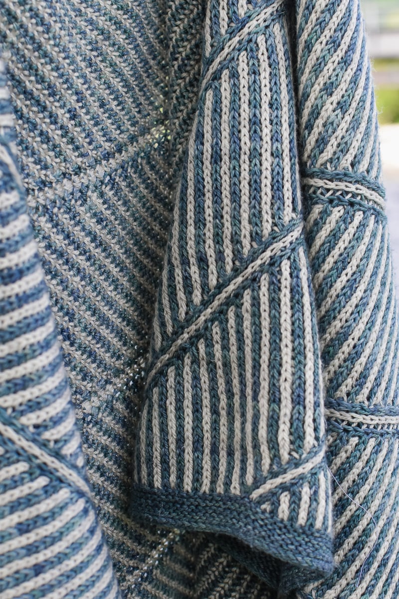 The shawl is knit sideways on the bias, starting at the top right corner, with increases along the beginning of the row to shape the triangle. The body of the shawl is knit in Stockinette Brioche with two contrasting shades. Increases and decreases create the intersecting diagonal lines. A border in Garter stitch surrounds the entire shawl to anchor the fabric, and an i-cord edge adds a neat finish.