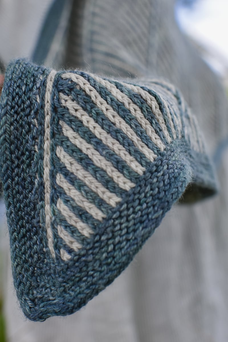 Wave Breaker is a reversible, triangular shawl featuring graphic stripes and a textured reverse side, knit in Stockinette brioche stitch.