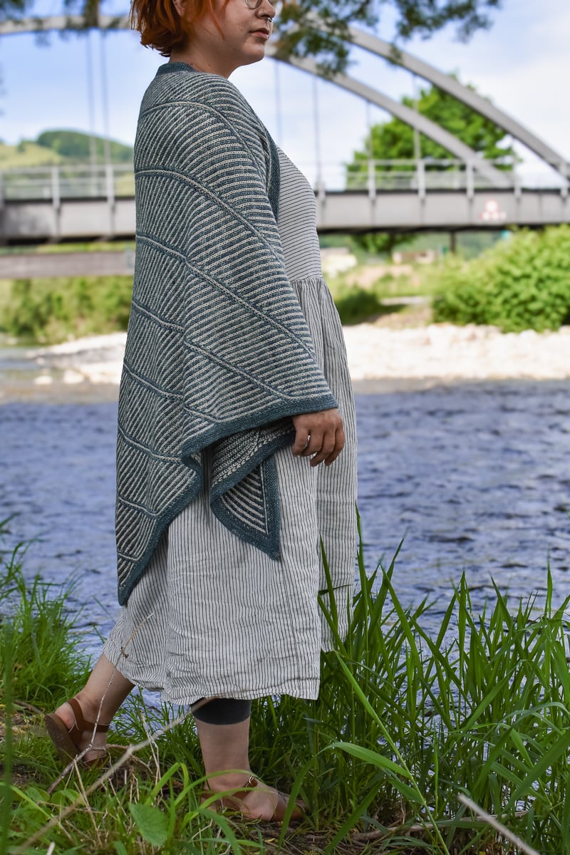 The graphic lines of Stockinette Brioche stitch are an abstract interpretation of the endless flow of ocean waters, the textured reverse side reminiscent of the crash of a breaking wave and ocean spray. Choose a summer yarn so you can wear this generous shawl throughout all seasons.