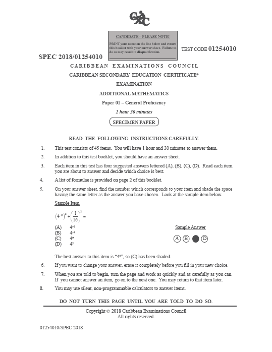 Specimen Paper 01 of the CSEC Additional Mathematics Examination, effective June 2021. Copyright by Caribbean Examinations Council.