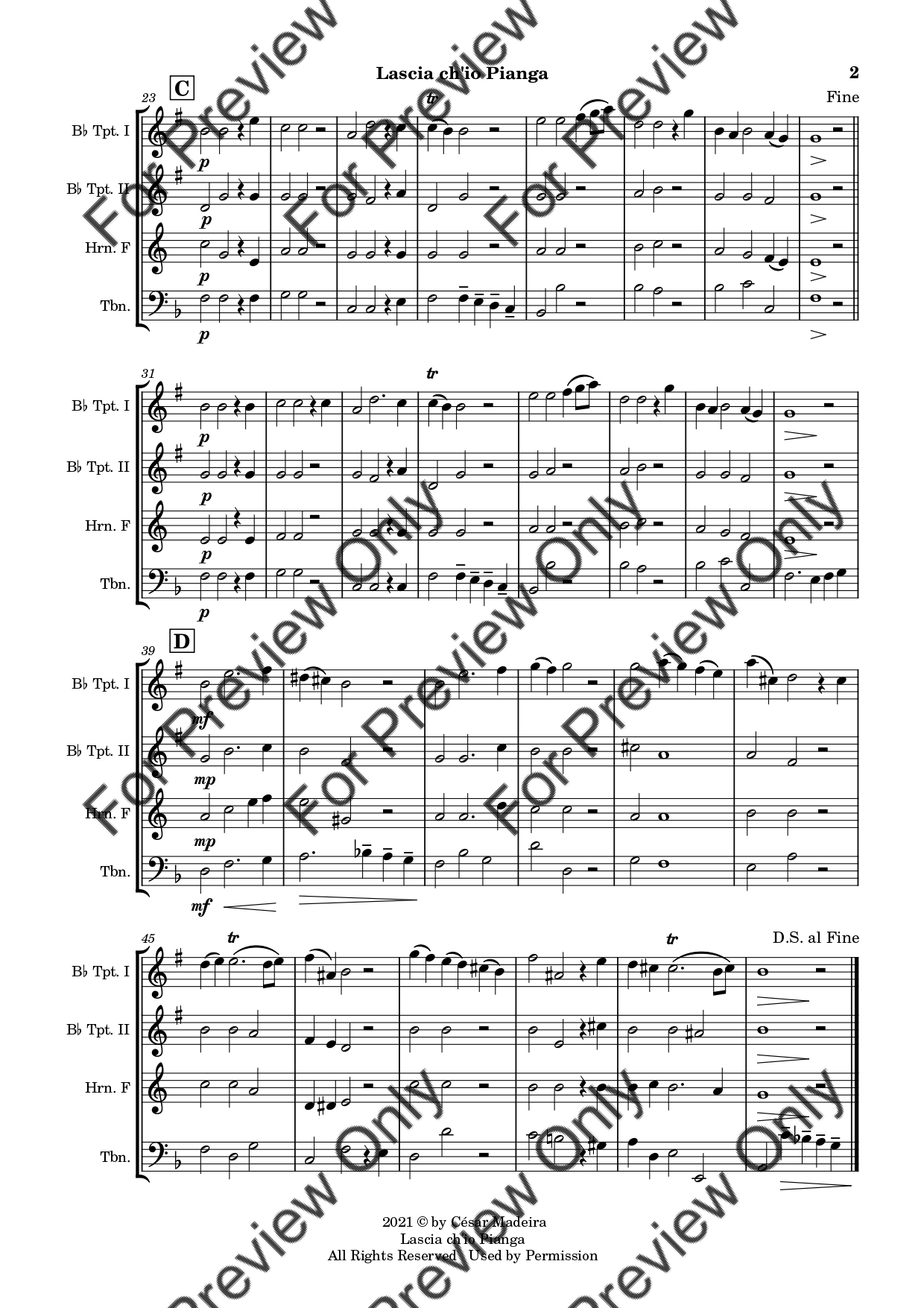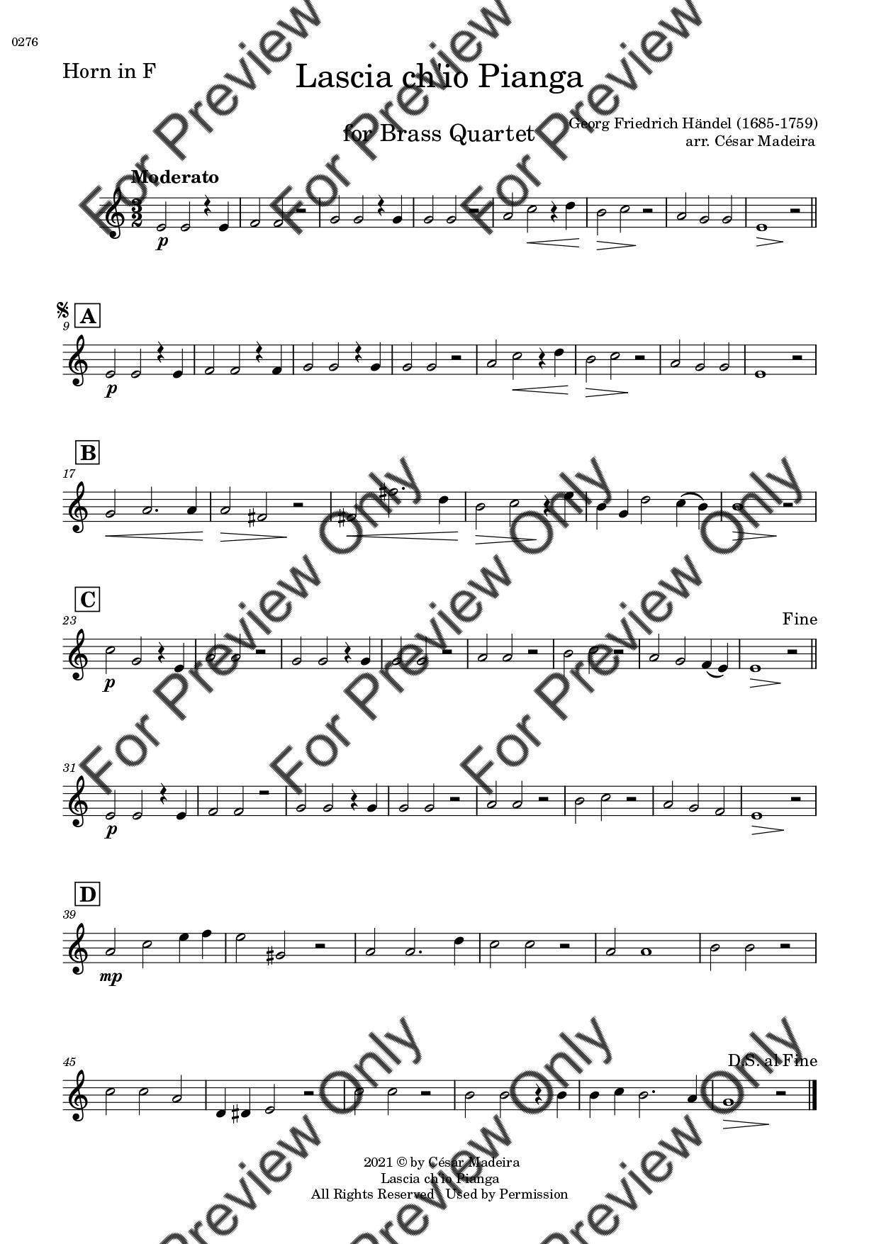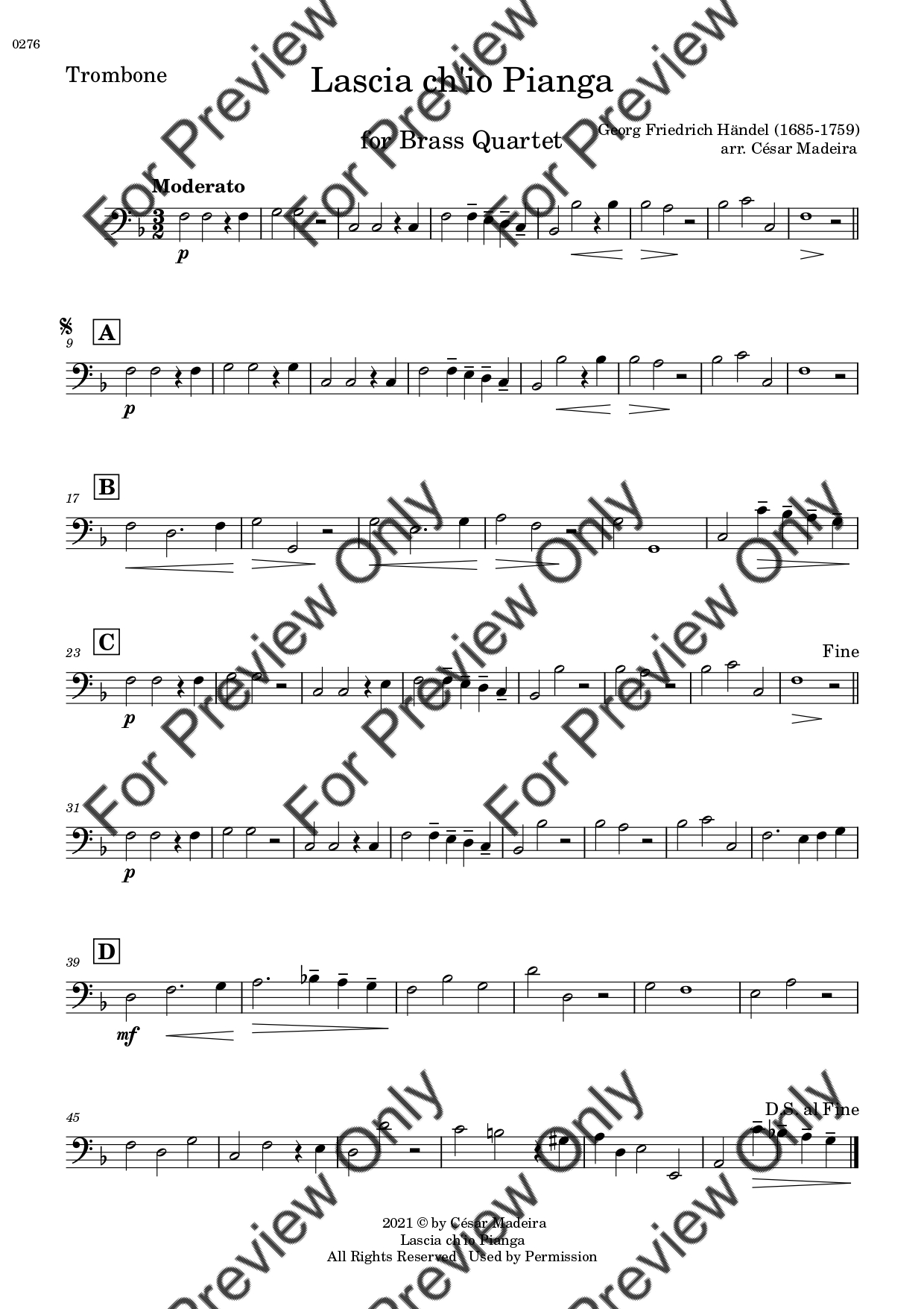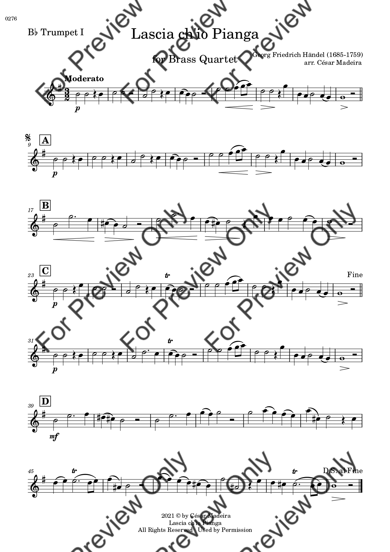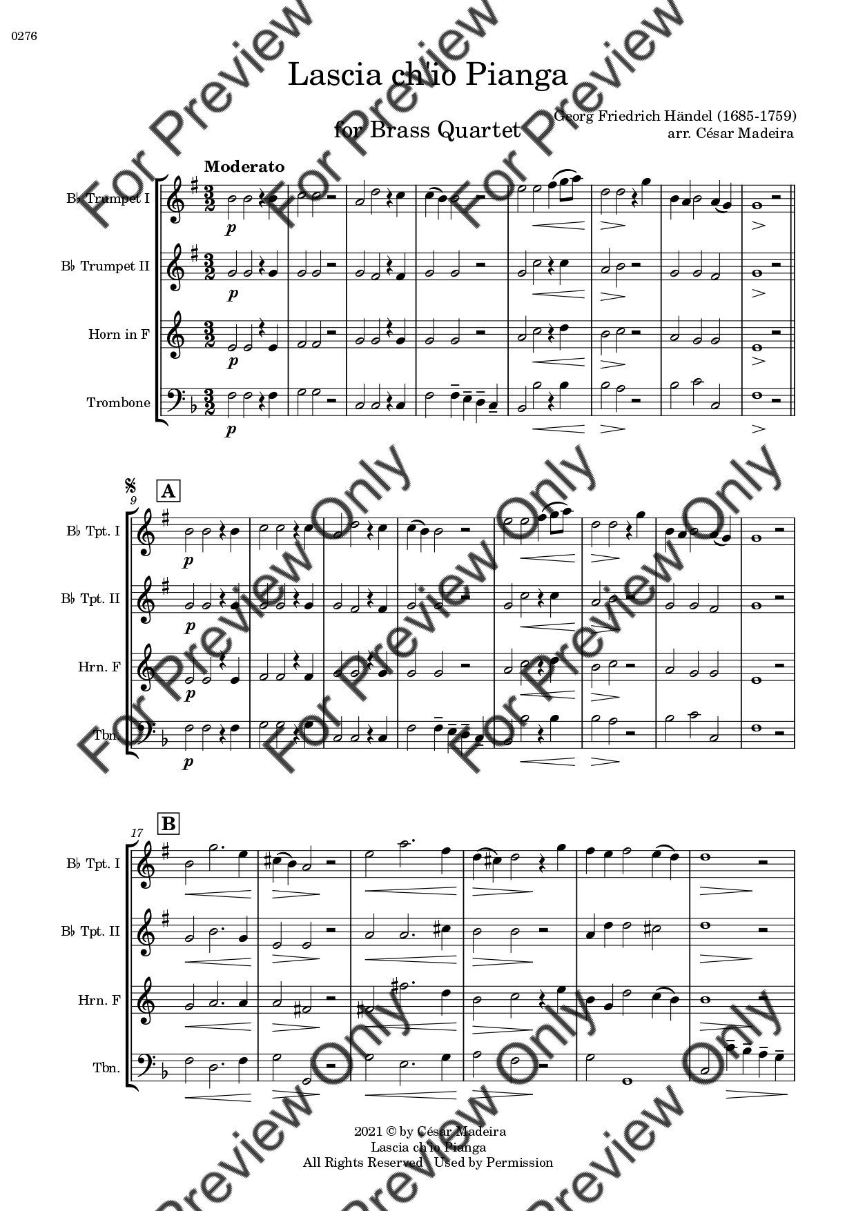 Lascia Ch'io Pianga by Georg Friedrich Handel. Arrangement for Brass Quartet - Bb Trumpet 1, 2, French Horn and Trombone. With Full Score and Individual Parts. Have fun!