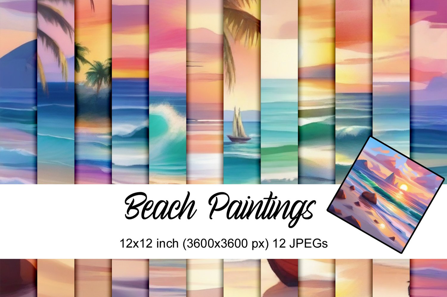 Beach paintings is collection of 12 digital images, in size of digital paper – 3600 x 3600 pixels (or 12×12 inches).