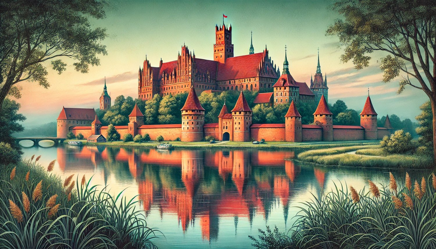 Fairytale Fortress of the Baltic – Poland – Malbork Castle is a breathtaking digital artwork capturing the largest brick castle in the world, standing majestically along the banks of a serene river. This Gothic architectural masterpiece, with its red-bricked towers, fortified walls, and grand spires, radiates a sense of medieval power and grandeur.