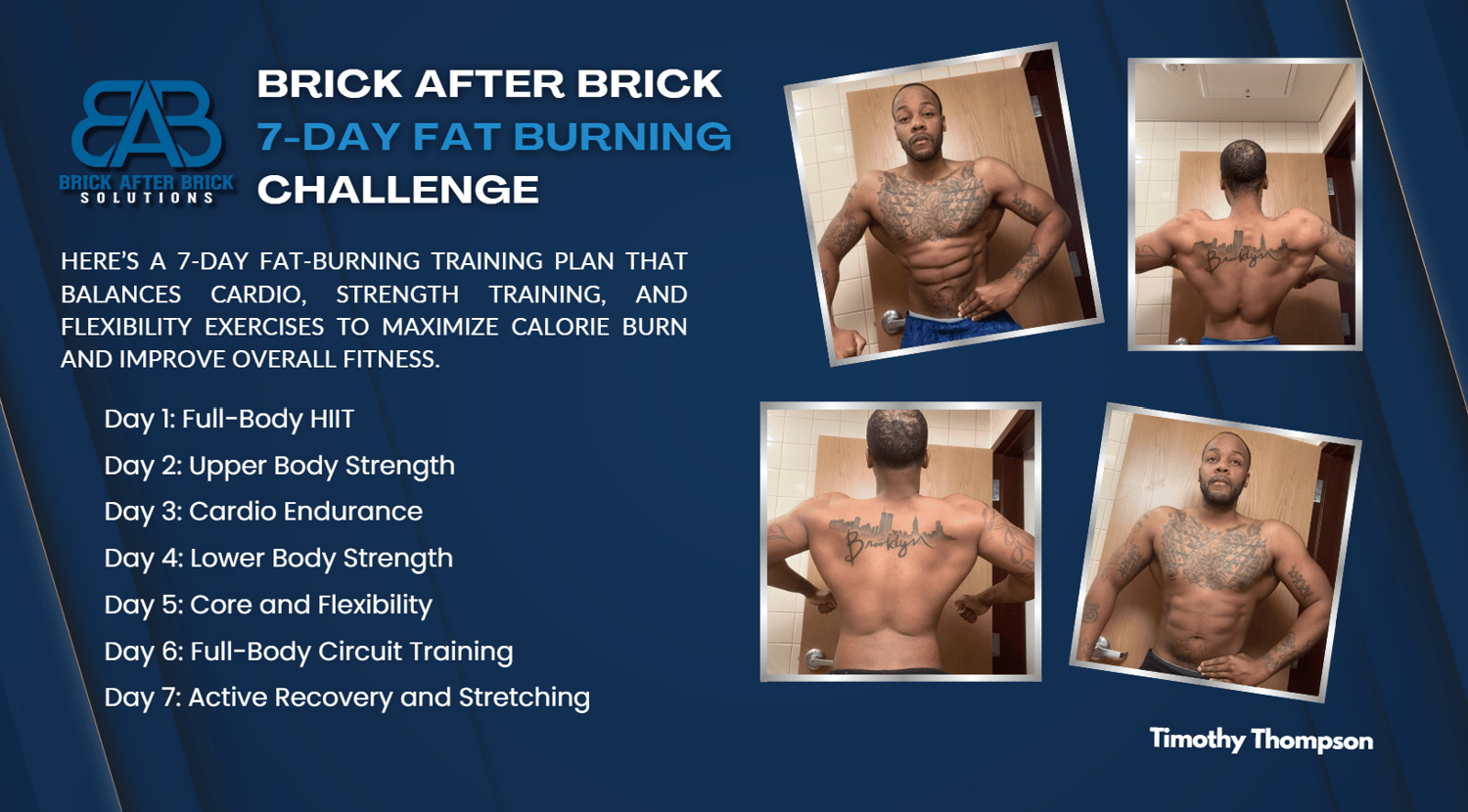 Attached is a copy of the 7 Day Fat Burning Challenge. There is a hyperlink attached to each exercise in the event that you are unfamiliar. In addition, the sets and reps are listed within each challenge. Lastly, I attached the Brick After Brick Goals tracker. In this tracker you are able to annotate all of your body metrics, set daily goals and track your weight.
