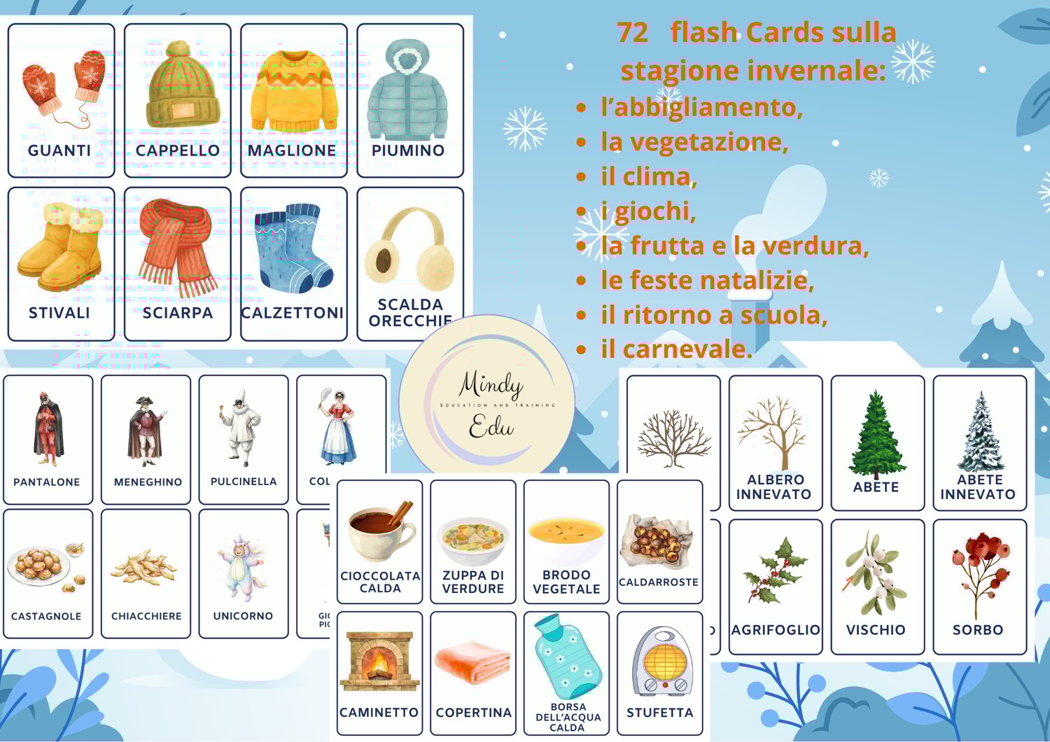 ❄️ Un set di 72 flashcards dedicate all’inverno per arricchire il vocabolario dei bambini in modo chiaro, visivo e coinvolgente.