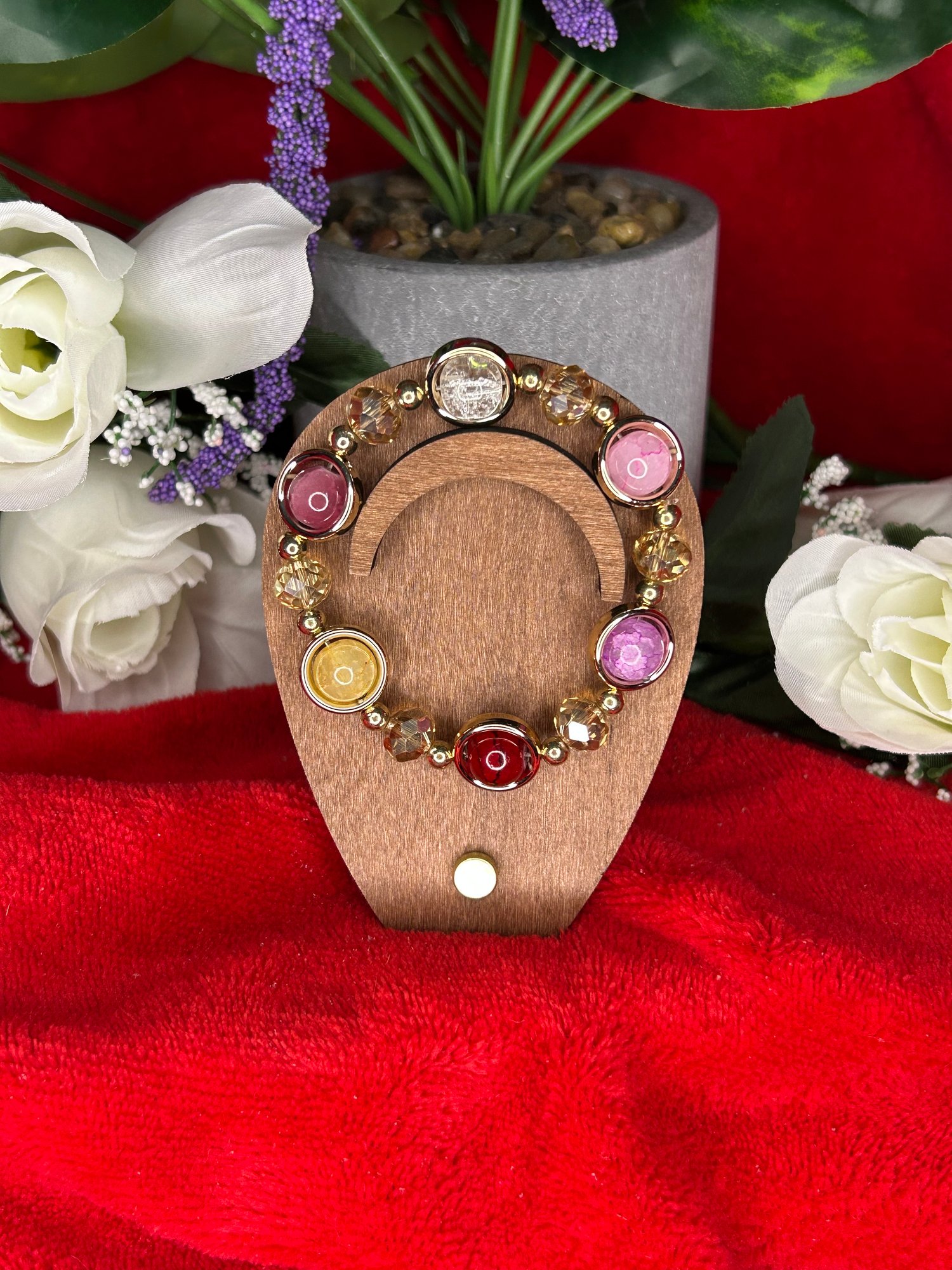 Fashion bracelet with multicolor domed beads—pink, purple, red, yellow, and clear, paired with faceted gold accents.
