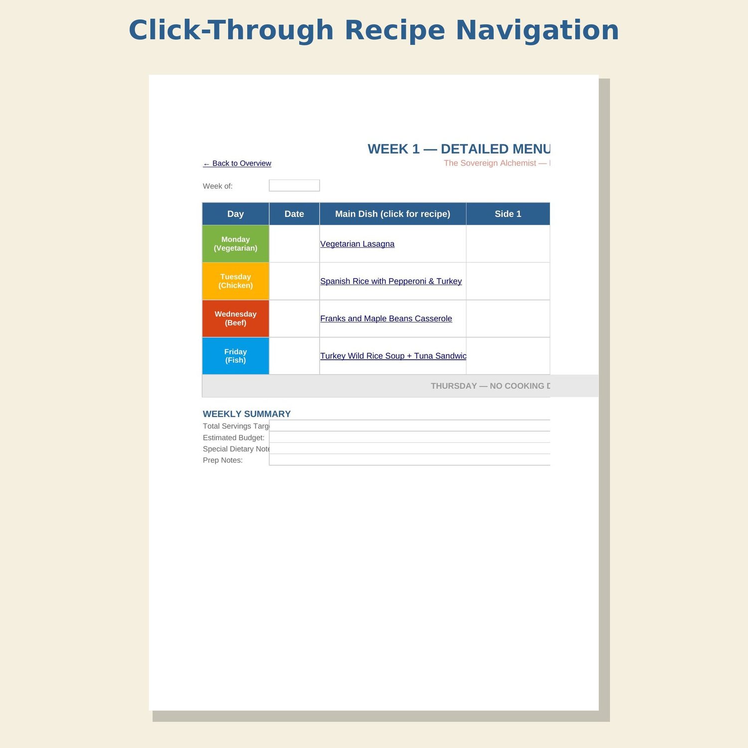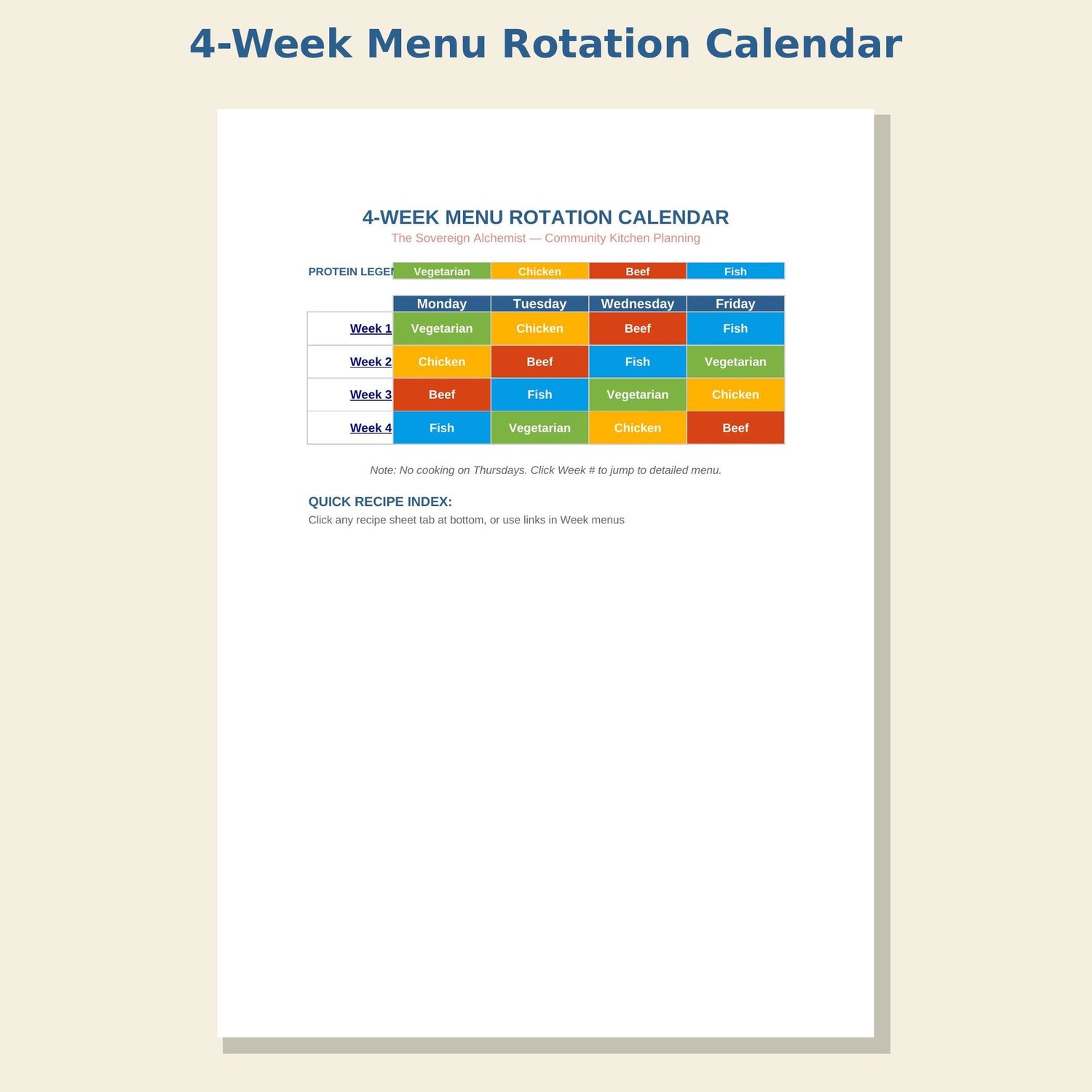 This is the rotation system I use in my own kitchen — a complete month of menus with recipes, costs, and shopping lists built right in. Plan once, rotate forever.