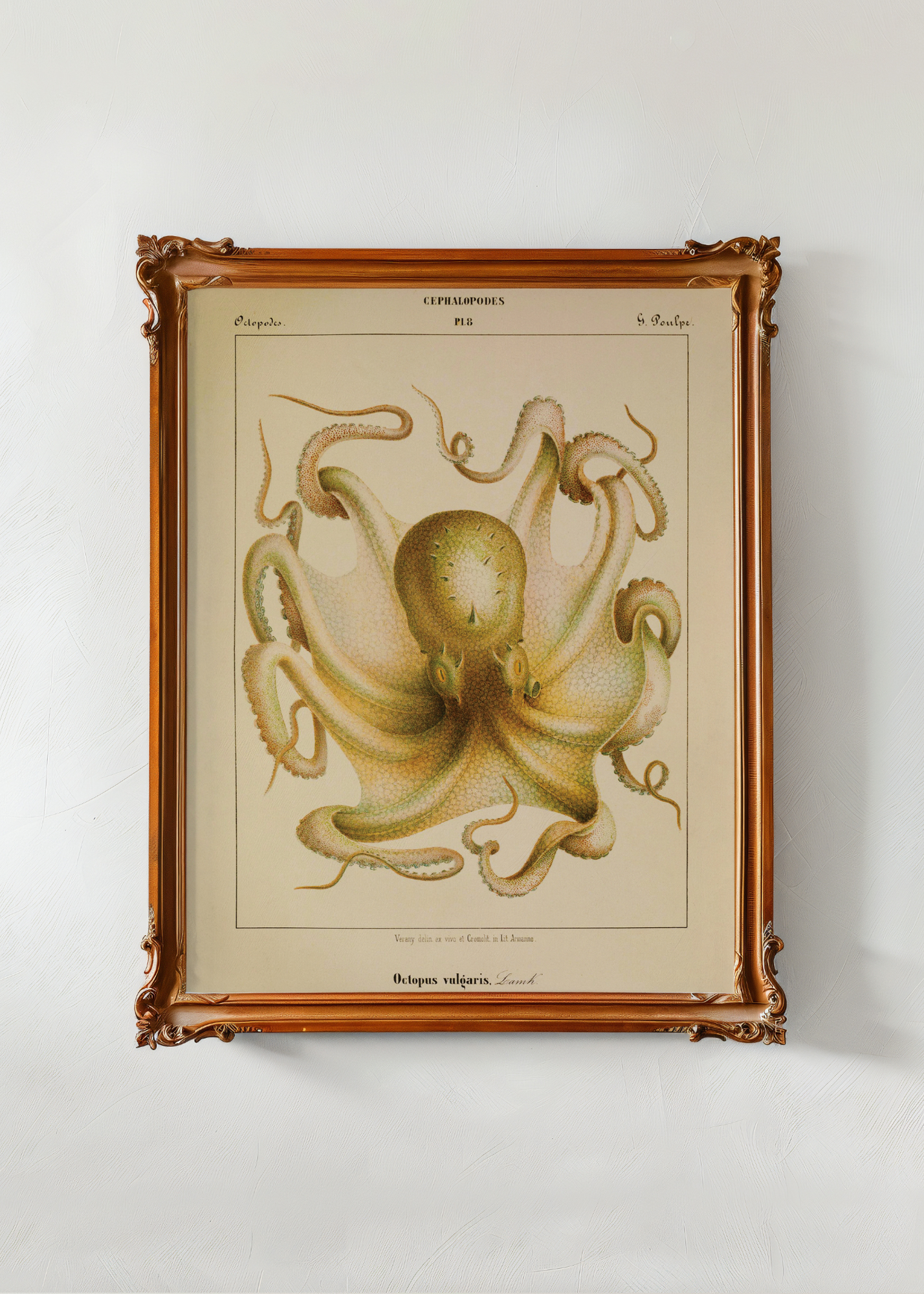 Octopus— Fluid as thought and strange as a dream, this vintage chromolithograph captures the octopus not as a curiosity, but as a marvel of living art. Octopus Vulgaris, rendered by Jean Baptiste Vérany, pulses with quiet intelligence—each arm unfurling like a question, each suckered limb a delicate, deliberate line between mystery and motion.