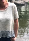 This oversized top, lots of positive airy ease, is worked seamlessly from the top down. It starts out with a separate back worked in the flat, and then the front to the arm holes. The fronts and backs are joined to work down in the round to the Brioche hem after the armholes are complete. Two colour brioche ends the sweater with a scalloped shell edge.