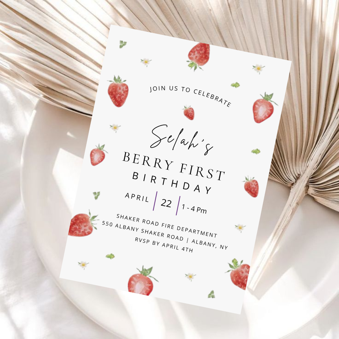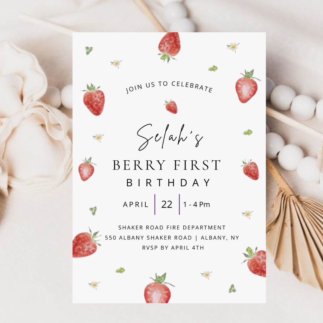 Celebrate your little one's "Berry First Birthday" with this adorable Strawberry-themed birthday invitation! This printable and editable 1st birthday invitation is perfect for girls and features a sweet, watercolor strawberry design. Ideal for spring or summer birthday parties, this digital invitation is easy to customize and instantly downloadable — no waiting!