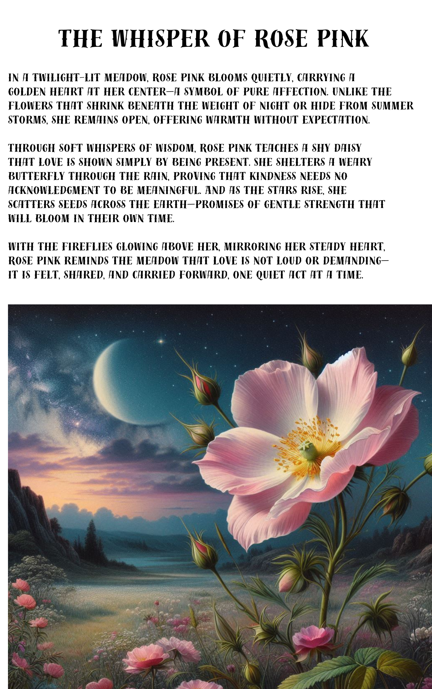 In a twilight-kissed meadow where lavender skies meet golden light, a wildflower named Rose Pink blooms—not with grandeur, but with grace. Her petals cradle a golden heart, whispering messages of affection to those too shy to ask for love. Through storms, silence, and soft exchanges, Rose Pink teaches us that the most powerful gifts are often the quietest ones.