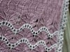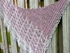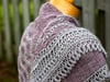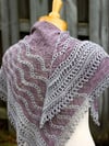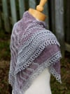 Soft lavender gives way to a subtle silver as simple twisted stitch columns race toward the lace edge. Scallops of silver bloom into a delicate applied lace border. Worked from tip to edge, this asymmetrical sideways shawl is super fun to knit and wear. Both written and charted instructions are provided.