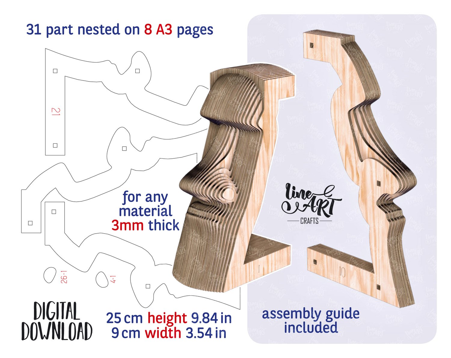 This is not a physical product. This is a vector template to make your own headphone stand out of any material 3 mm thick (like plywood, mdf, acrylic, cardboard, etc.) with laser cutter, CNC machine or scroll saw.