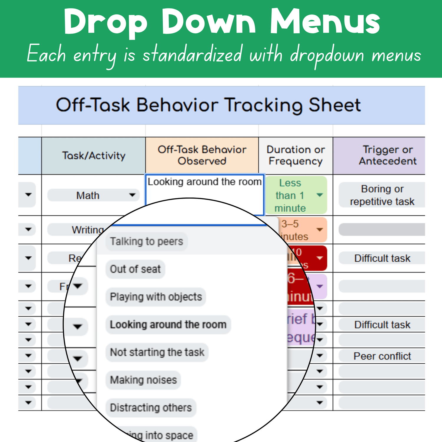 ✔ Dropdown Menus for Consistency – Select from pre-set options for setting, task, behavior, duration, trigger, and adult response.