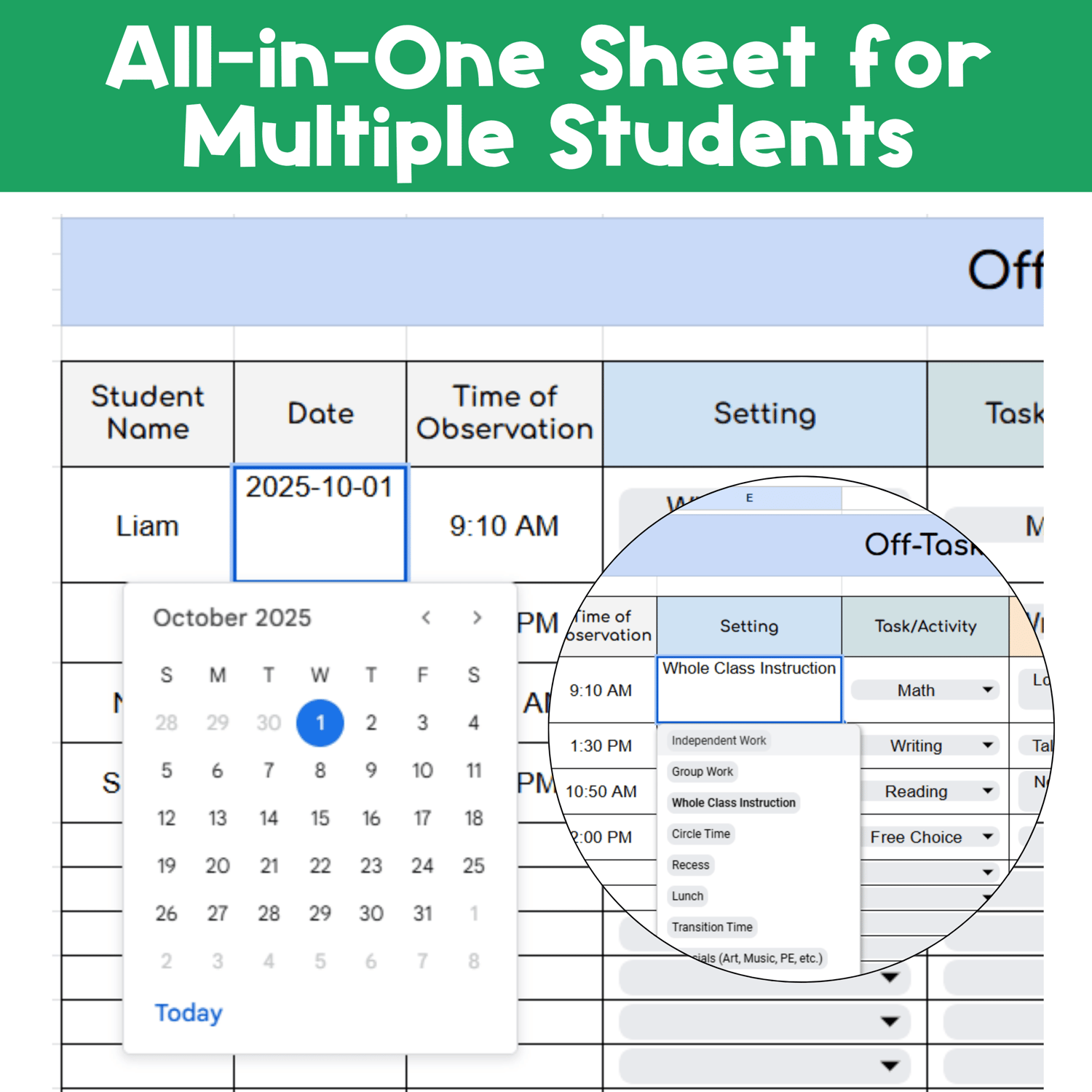 The On/Off Task Behavior Tracking Sheet is a user-friendly Google Sheets template designed to help special education teachers, general education teachers, behavior specialists, and support staff log, monitor, and analyze student behavior data in real time.