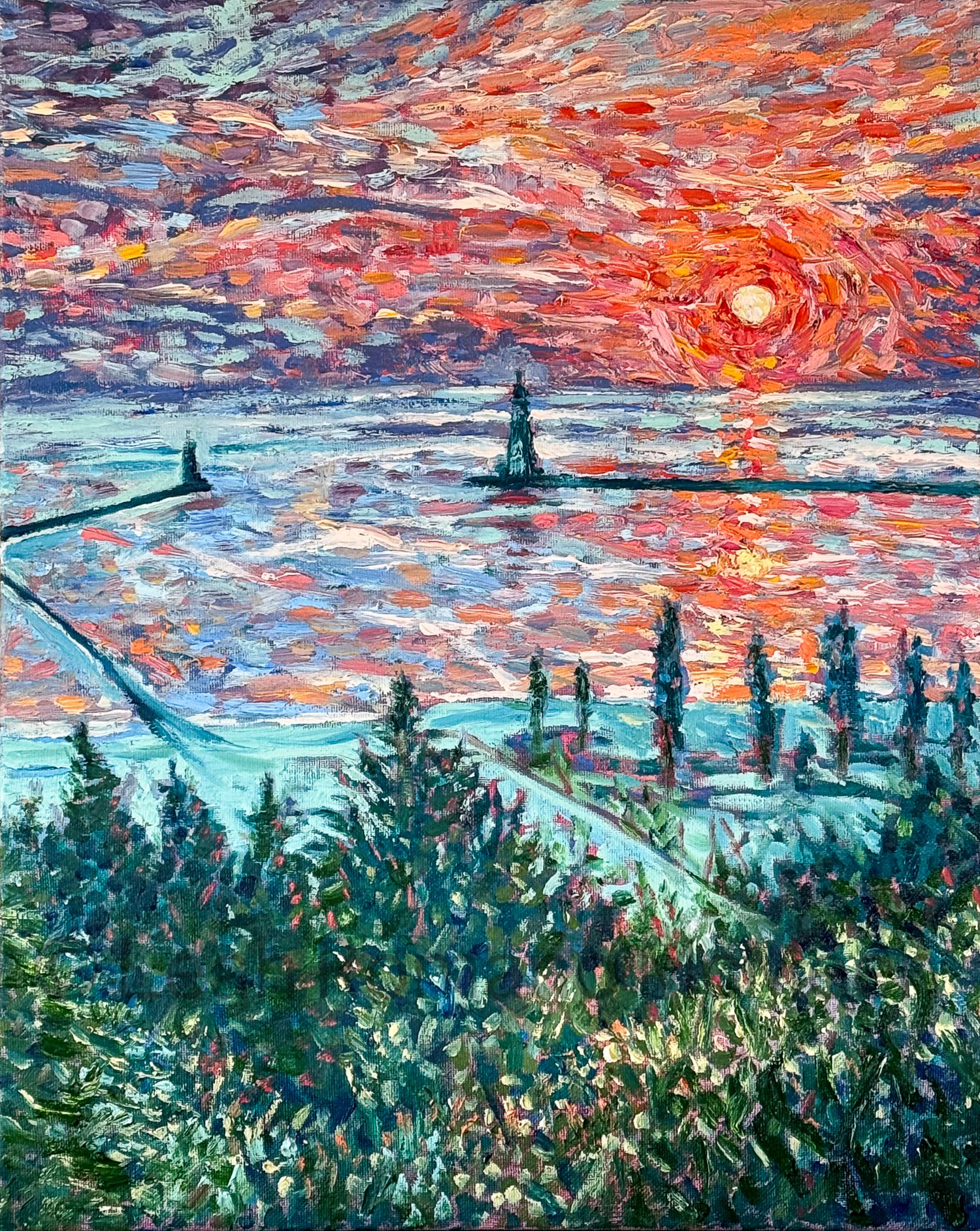 A contemporary imppressionism with vivid colors, thick impasto strokes that aren't overly layered and a bright underpainting. The paint strokes are intended to play off of one another and not just blend together.