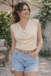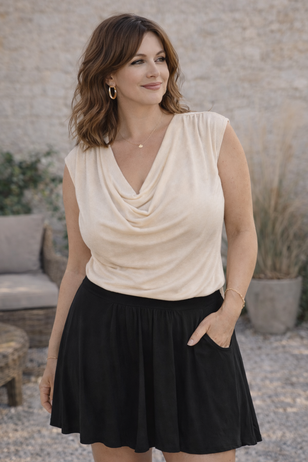 Son col drapé ultra flatteur qui met en valeur le décolleté avec douceur, et sa matière fluide qui tombe parfaitement. Il épouse les formes sans les coller, et s’adapte à toutes les silhouettes.